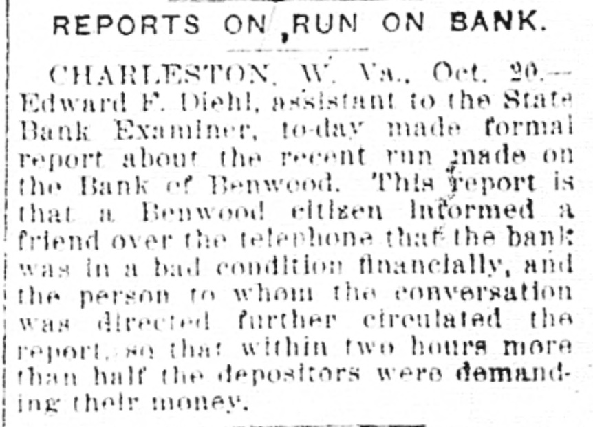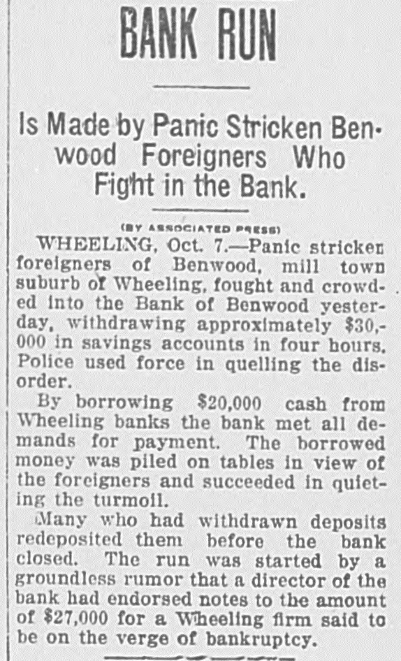 BANK RUN Is Made by Panic Stricken Benwood Foreigners Who Fight in the Bank. (BY ASSOCIATED PRESS) WHEELING, Oct. 7.-Panic stricker foreigners of Benwood, mill town suburb of Wheeling, fought and crowded into the Bank of Benwood yesterday, withdrawing approximately $30,000 in savings accounts in four hours. Police used force in quelling the disorder. By borrowing $20,000 cash from Wheeling banks the bank met all demands for payment. The borrowed money was piled on tables in view of the foreigners and succeeded in quieting the turmoil. Many who had withdrawn deposits redeposited them before the bank closed. The run was started by a groundless rumor that a director of the bank had endorsed notes to the amount of $27,000 for a Wheeling firm said to be on the verge of bankruptcy.