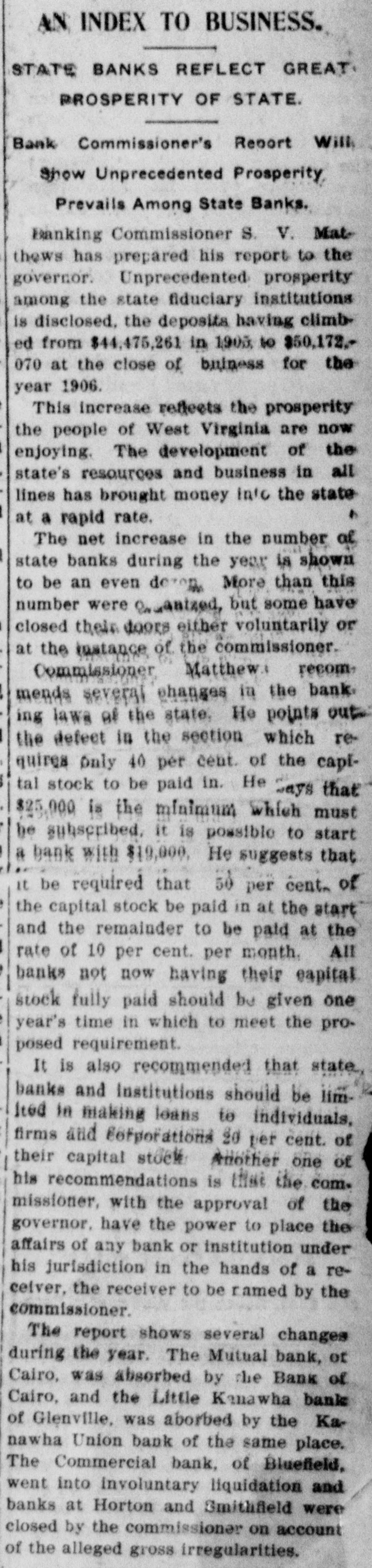 AN INDEX TO BUSINESS. STATE BANKS REFLECT GREAT PROSPERITY OF STATE. Bank Commissioner's Report Will Show Unprecedented Prosperity Prevails Among State Banks. Banking Commissioner S. V. Matthews has prepared his report to the governor. Unprecedented prosperity among the state fiduciary institutions is disclosed, the deposits having climbed from $44,475,261 in 1903 to $50,172.070 at the close of bulness for the year 1906. This increase reflects the prosperity the people of West Virginia are now enjoying. The development of the state's resources and business in all lines has brought money Into the state 4 at a rapid rate. The net increase in the number of state banks during the year is shown to be an even dezen More than this number were anized, but some have closed their doors either voluntarily or at the instance of the commissioner. Commissioner Matthew: recommends several changes in the bank. ing lawa of the state, He points out the defect in the section which requires Only 40 per cent. of the capital stock to be paid in. He ays that $25,000 is the minimum which must be subscribed, it is possible to start a bank with $19,000, He suggests that it be required that 50 per cent. of the capital stock be paid in at the start and the remainder to be paid at the rate of 10 per cent. per month. All banks not now having their capital stock fully paid should be given one year's time in which to meet the proposed requirement. It is also recommended that state banks and Institutions should be limlted in making loans to individuals, firms and Corporations 20 per cent. of their capital stock Another one of his recommendations is that the commissioner, with the approval of the governor. have the power to place the affairs of any bank or institution under his jurisdiction in the hands of a receiver, the receiver to be ramed by the commissioner. The report shows several changes during the year. The Mutual bank, or Cairo, was absorbed by the Bank of Cairo, and the Little Kanawha bank of Glenville, was aborbed by the Kanawha Union bank of the same place. The Commercial bank, of Bluefield, went into involuntary liquidation and banks at Horton and Smithfield were closed by the commissioner on account of the alleged gross irregularities.