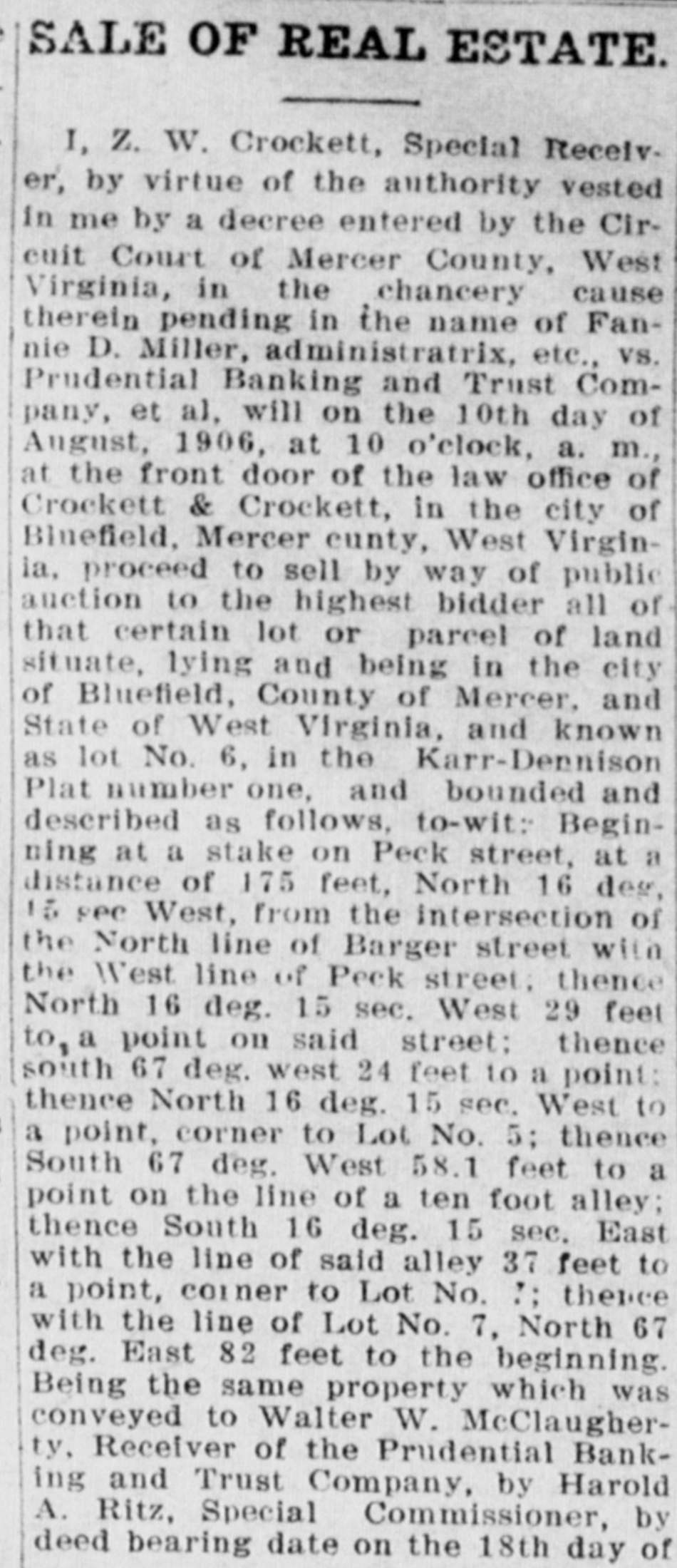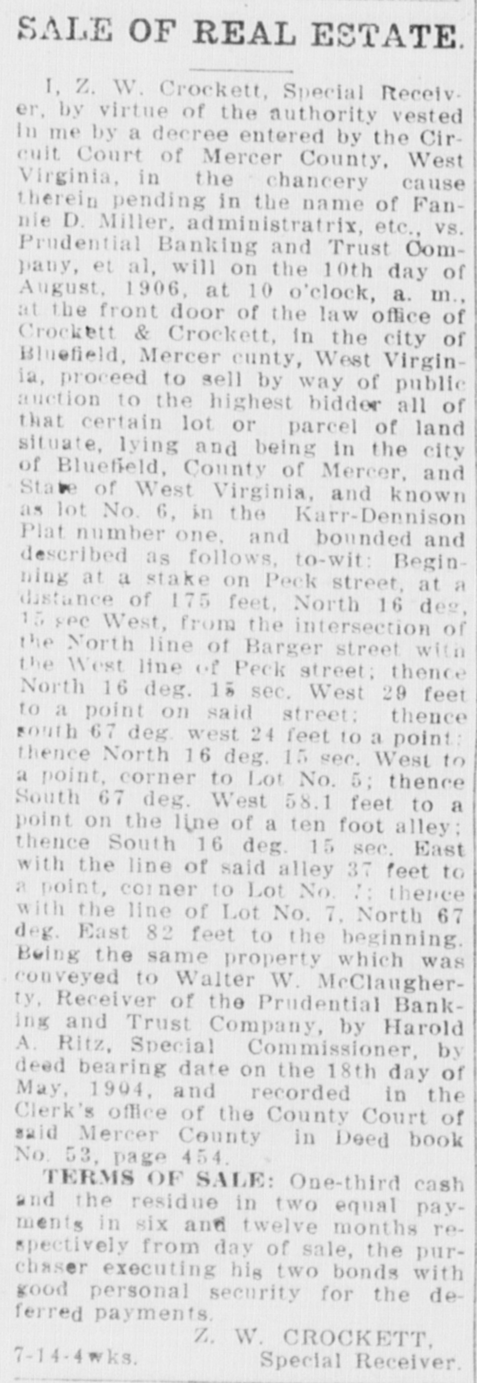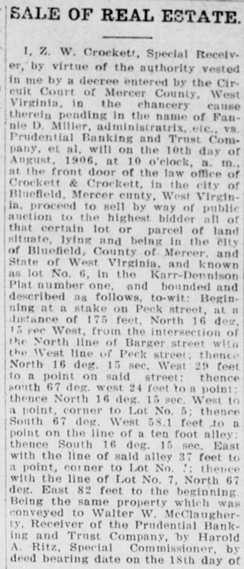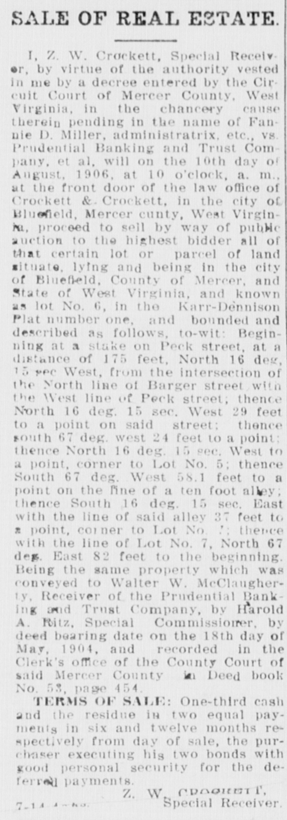 # SALE OF REAL ESTATE. I, Z. W. Crockett, Special Receiver, by virtue of the authority vested in me by a decree entered by the Circuit Court of Mercer County, West Virginia, in the chancery cause therein pending in the name of Fannie D. Miller, administratrix, etc., vs. Prudential Banking and Trust Company, et al, will on the 10th day of August, 1906, at 10 o'clock, a. m., at the front door of the law office of Crockett & Crockett, in the city of Bluefield, Mercer cunty, West Virginia, proceed to sell by way of public auction to the highest bidder all of that certain lot or parcel of land situate, lying and being in the city of Bluefield, County of Mercer, and State of West Virginia, and known as lot No. 6, in the Karr-Dernison Plat number one, and bounded and described as follows, to-wit: Beginning at a stake on Peck street, at a distance of 175 feet, North 16 deg, 15 sec West, from the intersection of the North line of Barger street with the West line of Peck street, thence North 16 deg. 15 sec. West 29 feet to a point on said street: thence south 67 deg. west 24 feet to a point: thence North 16 deg. 15 sec. West to a point, corner to Lot No. 5; thence South 67 deg. West 58.1 feet to a point on the line of a ten foot alley; thence South 16 deg. 15 sec. East with the line of said alley 37 feet to a point, corner to Lot No. 7; thence with the line of Lot No. 7, North 67 deg. East 82 feet to the beginning. Being the same property which was conveyed to Walter W. McClaugherty, Receiver of the Prudential Banking and Trust Company, by Harold A. Ritz, Special Commissioner, by deed bearing date on the 18th day of
