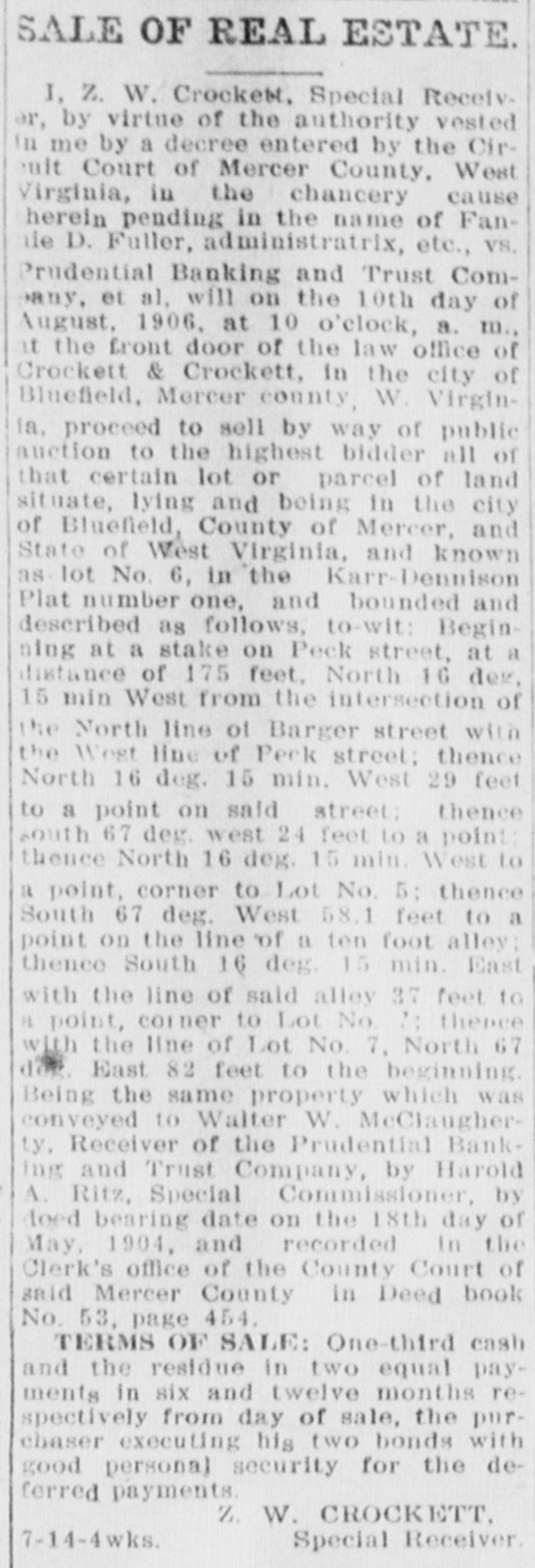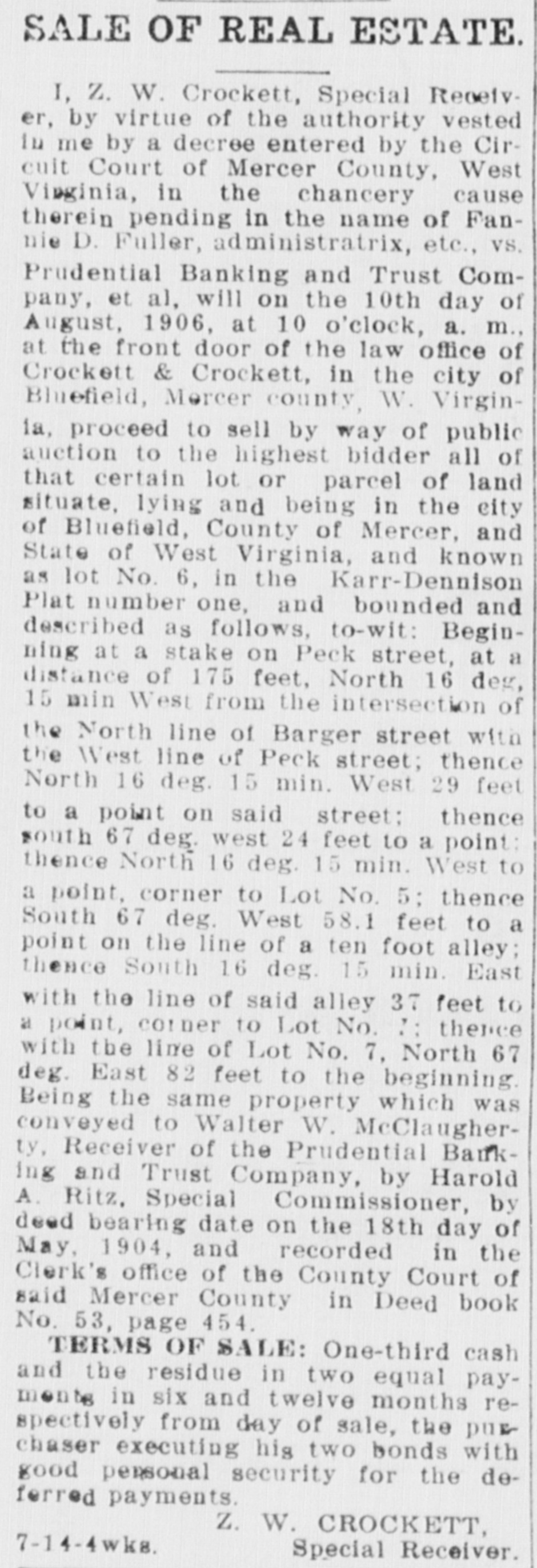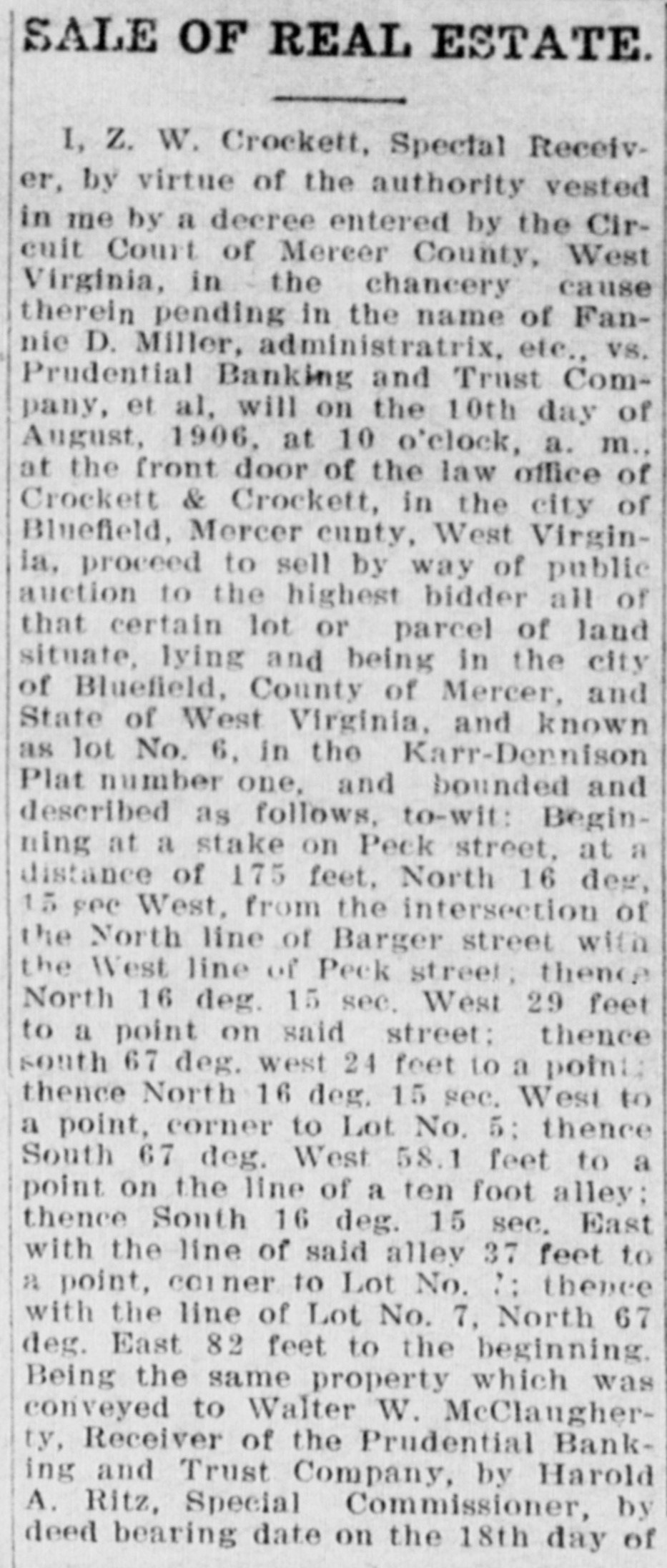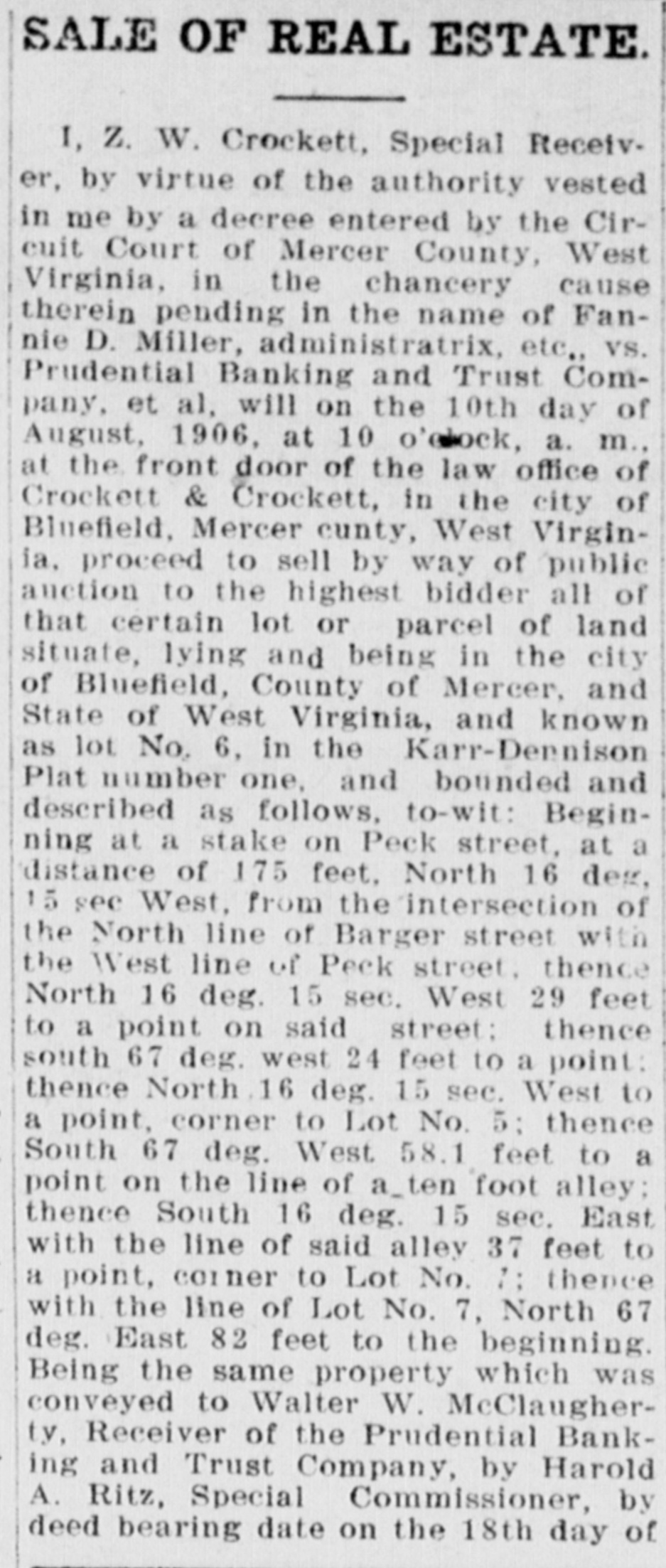 # SALE OF REAL ESTATE. I, Z. W. Crockett, Special Receiver, by virtue of the authority vested in me by a decree entered by the Circuit Court of Mercer County, West Virginia, in the chancery cause therein pending in the name of Fannie D. Miller, administratrix, etc., vs. Prudential Banking and Trust Company, et al, will on the 10th day of August, 1906, at 10 o'clock, a. m., at the front door of the law office of Crockett & Crockett, in the city of Bluefield, Mercer cunty, West Virginia, proceed to sell by way of public auction to the highest bidder all of that certain lot or parcel of land situate, lying and being in the city of Bluefield, County of Mercer, and State of West Virginia, and known as lot No. 6, in the Karr-Dernison Plat number one, and bounded and described as follows, to-wit: Beginning at a stake on Peck street, at a distance of 175 feet, North 16 deg, 15 sec West, from the intersection of the North line of Barger street with the West line of Peck street, thence North 16 deg. 15 sec. West 29 feet to a point on said street: thence south 67 deg. west 24 feet to a point: thence North 16 deg. 15 sec. West to a point, corner to Lot No. 5; thence South 67 deg. West 58.1 feet to a point on the line of a ten foot alley; thence South 16 deg. 15 sec. East with the line of said alley 37 feet to a point, corner to Lot No. 7; thence with the line of Lot No. 7, North 67 deg. East 82 feet to the beginning. Being the same property which was conveyed to Walter W. McClaugherty, Receiver of the Prudential Banking and Trust Company, by Harold A. Ritz, Special Commissioner, by deed bearing date on the 18th day of