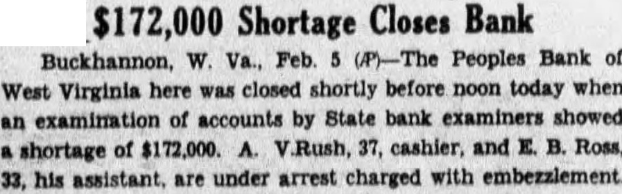 $172,000 Shortage Closes Bank Buckhannon, W. Va., Feb 5 (/P)-The Peoples Bank of West Virginia here was closed shortly before noon today when an examination of accounts by State bank examiners showed shortage of $172,000. A. V.Rush, 37, cashier, and E. B. Ross, 33, his assistant. are under arrest charged with embezziement.