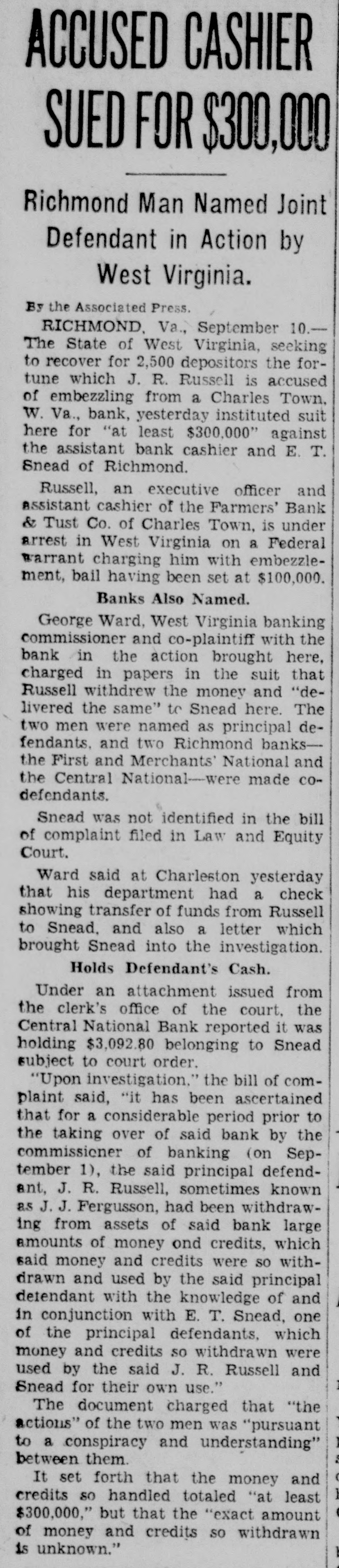 ACCUSED CASHIER SUED FOR $300,000 Richmond Man Named Joint Defendant in Action by West Virginia. By the Associated Press. RICHMOND. Va., September 10.The State of West Virginia, seeking to recover for 2,500 depositors the fortune which J. R. Russell is accused of embezzling from a Charles Town, W. Va., bank, yesterday instituted suit here for "at least $300,000" against the assistant bank cashier and E. T. Snead of Richmond. Russell, an executive officer and assistant cashier of the Farmers' Bank & Tust Co. of Charles Town, is under arrest in West Virginia on a Federal warrant charging him with embezzlement, bail having been set at $100,000. Banks Also Named. George Ward, West Virginia banking commissioner and co-plaintiff with the bank in the action brought here, charged in papers in the suit that Russell withdrew the money and "delivered the same" to Snead here. The two men were named as principal defendants. and two Richmond banksthe First and Merchants' National and the Central National-were made COdefendants. Snead was not identified in the bill of complaint filed in Law and Equity Court. Ward said at Charleston yesterday that his department had a check showing transfer of funds from Russell to Snead, and also a letter which brought Snead into the investigation. Holds Defendant's Cash. Under an attachment issued from the clerk's office of the court, the Central National Bank reported it was holding $3,092.80 belonging to Snead subject to court order. "Upon investigation." the bill of complaint said, "it has been ascertained that for a considerable period prior to the taking over of said bank by the commissioner of banking (on September 1), the said principal defendant, J. R. Russell, sometimes known as J.J. Fergusson, had been withdrawing from assets of said bank large amounts of money ond credits, which said money and credits were so withdrawn and used by the said principal detendant with the knowledge of and in conjunction with E. T. Snead, one of the principal defendants, which money and credits so withdrawn were used by the said J. R. Russell and 1 Snead for their own use." The document charged that "the : actions" of the two men was "pursuant 1 to a conspiracy and understanding" between them. ( It set forth that the money and 1 credits so handled totaled "at least ( $300,000," but that the "exact amount of money and credits so withdrawn is unknown."