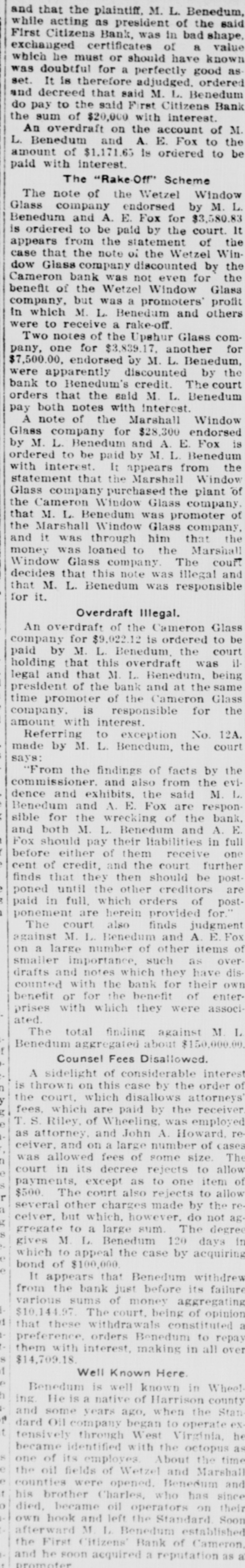 # BANK WRECKING CASE DECIDED and that the plaintiff, M. L. Benedum, while acting as president of the said First Citizens Bank, was in bad shape, exchanged certificates of a value which he must or should have known was doubtful for a perfectly good asset. It is therefore adjudged, ordered and decreed that said M. L. Benedum do pay to the said First Citizens Bank the sum of $20,000 with interest. An overdraft on the account of M. L. Benedum and A. E. Fox to the amount of $1,171.65 is ordered to be paid with interest. ## The "Rake-Off" Scheme The note of the Wetzel Window Glass company endorsed by M. L. Benedum and A. E. Fox for $3,580.83 is ordered to be paid by the court. It appears from the statement of the case that the note of the Wetzel Window Glass company discounted by the Cameron bank was not even for the benefit of the Wetzel Window Glass company, but was a promoters' profit In which M. L. Benedum and others were to receive a rake-off. Two notes of the Upshur Glass company, one for $3,839.17, another for $7,500.00, endorsed by M. L. Benedum, were apparently discounted by the bank to Benedum's credit. The court orders that the said M. L. Benedum pay both notes with Interest. A note of the Marshall Window Glass company for $28,300 endorsed by M. L. Benedum and A. E. Fox is ordered to be paid by M. L. Benedum with interest. It appears from the statement that the Marshall Window Glass company purchased the plant of the Cameron Window Glass company, that M. L. Benedum was promoter of the Marshall Window Glass company, and it was through him that the money was loaned to the Marshall Window Glass company. The court decides that this note was illegal and that M. L. Benedum was responsible for it. ## Overdraft Illegal. An overdraft of the Cameron Glass company for $9,022.12 is ordered to be paid by M. L. Benedum, the court holding that this overdraft was illegal and that M. L. Benedum, being president of the bank and at the same time promoter of the Cameron Glass company, is responsible for the amount with interest. Referring to exception No. 12A, made by M. L. Benedum, the court says: "From the findings of facts by the commissioner, and also from the evidence and exhibits, the said M. L. Benedum and A. E. Fox are responsible for the wrecking of the bank, and both M. L. Benedum and A. E. Fox should pay their liabilities in full before either of them receive one cent of credit, and the court further finds that they then should be postponed until the other creditors are paid in full, which orders of postponement are herein provided for." The court also finds judgment against M. L. Benedum and A. E. Fox on a large number of other items of smaller importance, such as overdrafts and notes which they have discounted with the bank for their own benefit or for the benefit of enterprises with which they were associated. The total finding against M. L. Benedum aggregated about $150,000.00 ## Counsel Fees Disallowed. A sidelight of considerable interest is thrown on this case by the order of the court, which disallows attorneys' fees, which are paid by the receiver. T. S. Riley, of Wheeling, was employed as attorney, and John A. Howard, receiver, and on a large number of cases was allowed fees of some size. The court in its decree rejects to allow payments, except as to one item of $500. The court also rejects to allow several other charges made by the receiver, but which, however, do not aggregate to a large sum. The degree gives M. L. Benedum 120 days in which to appeal the case by acquiring bond of $100,000. It appears that Benedum withdrew from the bank just before its failure various sums of money aggregating $10,144.97. The court, being of opinion that these withdrawals constituted a preference, orders Benedum to repay them with interest, making in all over $14,709.18. ## Well Known Here. Benedum is well known in Wheeling. He is a native of Harrison county and some years ago, when the Standard Oil company began to operate extensively through West Virginia, he became identified with the octopus as sone of its employes. About the time the oil fields of Wetzel and Marshall counties were opened, Benesum and this brother Charles, who has since died, became oil operators on their own hook and left the Standard. Soon afterward M. L. Benedum established the First Citizens' Bank of Cameron, and he soon acquired a reputation as a prom-