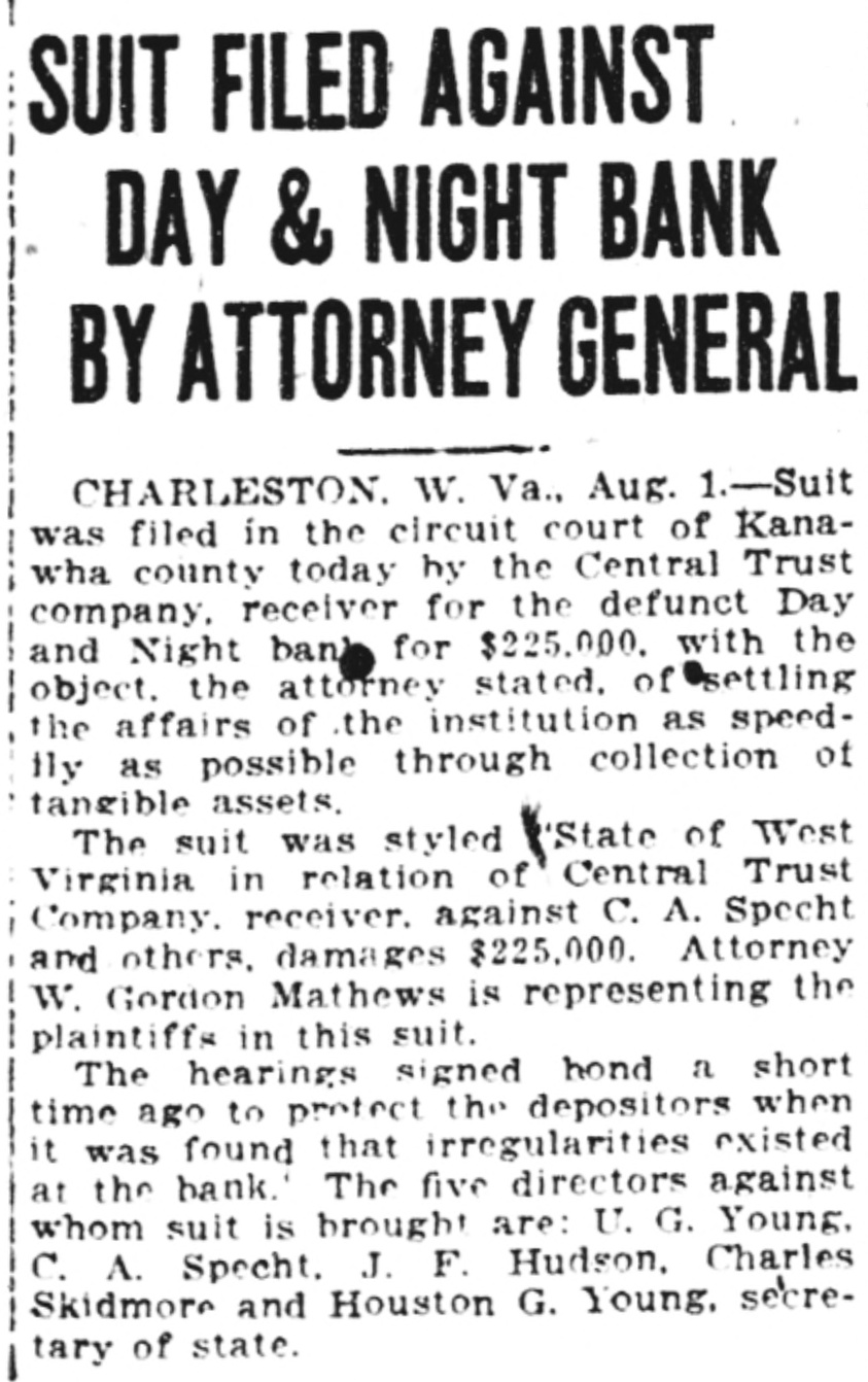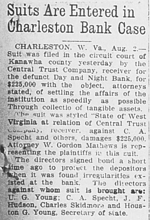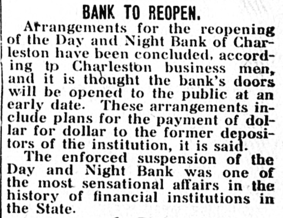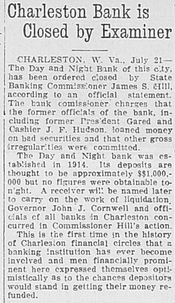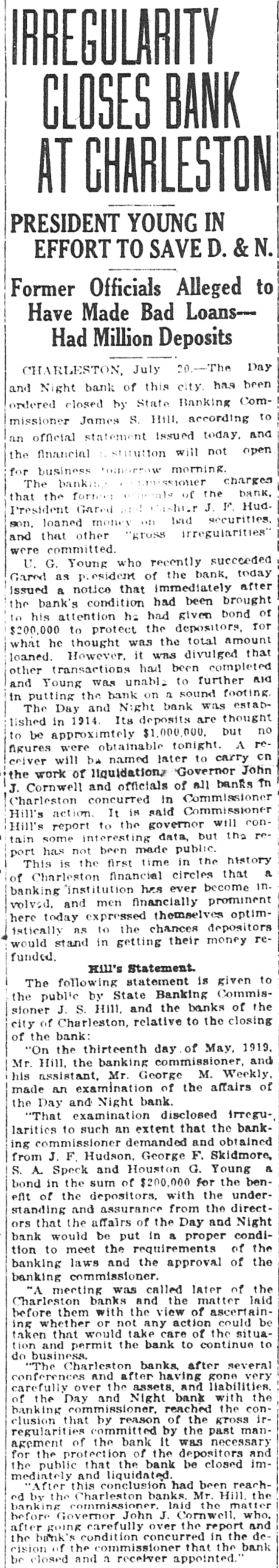 IRREGULARITY CLOSES BANK AT CHARLESTON PRESIDENT YOUNG IN EFFORT TO SAVE D. & N. Former Officials Alleged to Have Made Bad LoansHad Million Deposits CHARLESTON, July 20.--The Day and Night bank of this city has been ordered closed by State Banking Commissioner James S. Hill, according to an official statement issued today. and the financial stitution will not open for business tomorro w morning. The bank: sioner charges that the for of the bank, President Gared are ashier J. F. Hudson. loaned money on had securities. and that other gross irregularities were committed U. G. Young who recently succeeded Gared as president of the bank, today Issued a notico that immediately after the bank's condition had been brought to his attention he had given bond of $200,000 to protect the depositors, for what he thought was the total amount loaned. However, it was divulged that other transactions had been completed and Young was unable to further aid in putting the bank on a sound footing. The Day and Night bank was established in 1914. Its deposits are thought to be approximtely $1,000,000. but no figures were obtainable tonight. A receiver will ba named later to carry cn the work of liquidation Governor John J. Cornwell and officials of all banks in Charleston concurred in Commissioner Hill's action. It is said Commissioner Hill's report to the governor will contain some interesting data, but the report has not been made public. This is the first time in the history a of Charleston financial circles that banking institution has ever become involved. and men financially prominent here today expressed themselves optimistically as to the chances depositors would stand in getting their money refunded. Hill's Statement. The following statement is given to the public by State Banking Commissioner J. S. Hill, and the banks of the city of Charleston, relative to the closing of the bank: "On the thirteenth day of May, 1919. Mr. Hill, the banking commissioner, and his assistant, Mr. George M. Weekly, made an examination of the affairs of the Day and Night bank. "That examination disclosed irregularities to such an extent that the banking commissioner demanded and obtained from J. F. Hudson. George F. Skidmore, S. A. Speck and Houston G. Young a bond in the sum of $200,000 for the benefit of the depositors, with the understanding and assurance from the directors that the affairs of the Day and Night bank would be put in a proper condition to meet the requirements of the banking laws and the approval of the banking commissioner. "A meeting was called later of the Charleston banks and the matter laid before them with the view of ascertaining whether or not any action could be taken that would take care of the situation and permit the bank to continue to do business. "The Charleston banks, after several conferences and after having gone very carefully over the assets, and liabilities. of the Day and Night bank with the banking commissioner, reached the conclusion that by reason of the gross irregularities committed by the past management of the bank it was necessary for the protection of the depositors and the public that the bank be closed immediately and liquidated. "After this conclusion had been reached by the Charleston banks. Mr. Hill. the banking commissioner. laid the matter before Governor John J. Cornwell, who, after going carefully over the report and the bank's condition concurred in the decision of the commissioner that the bank be closed and a receiver appointed."