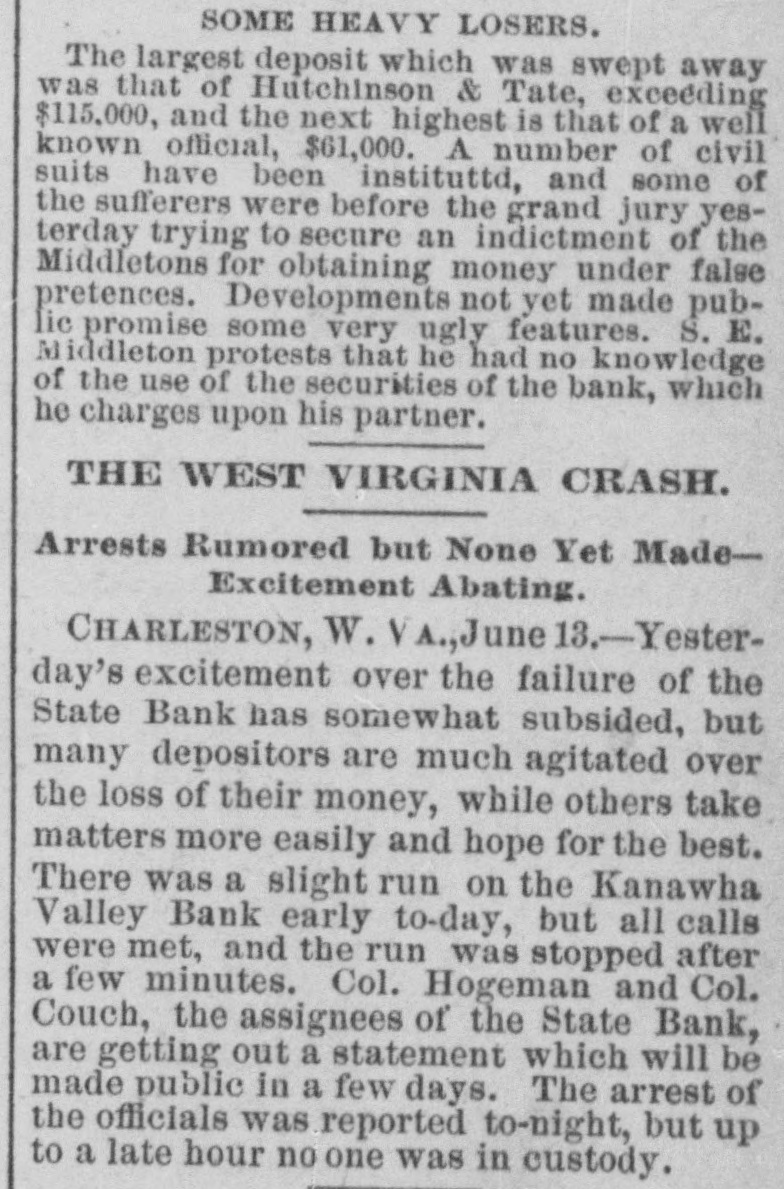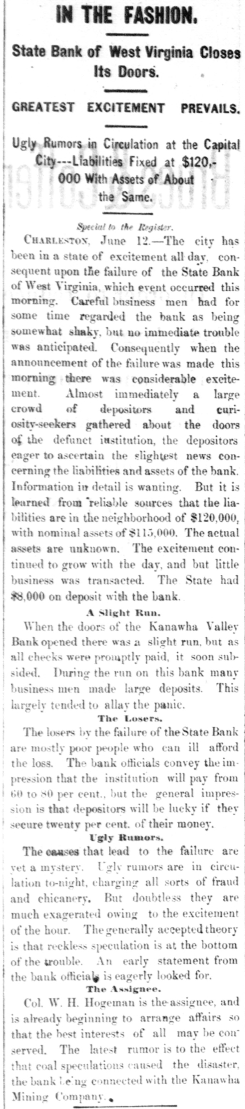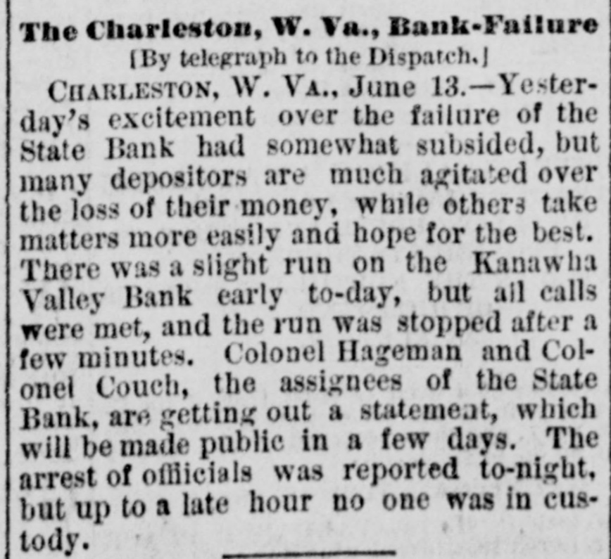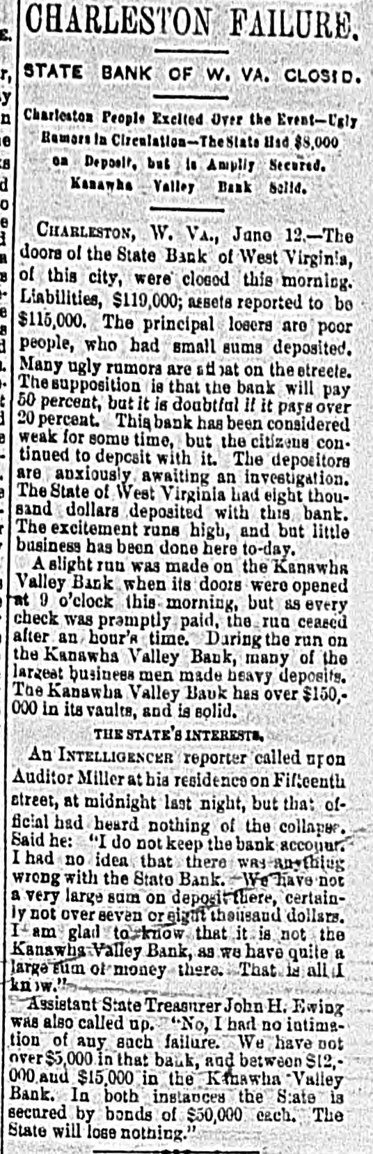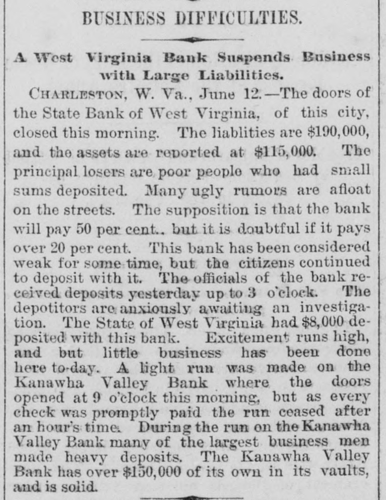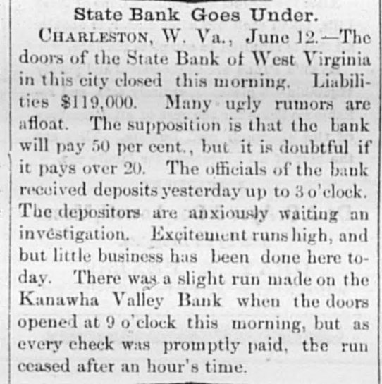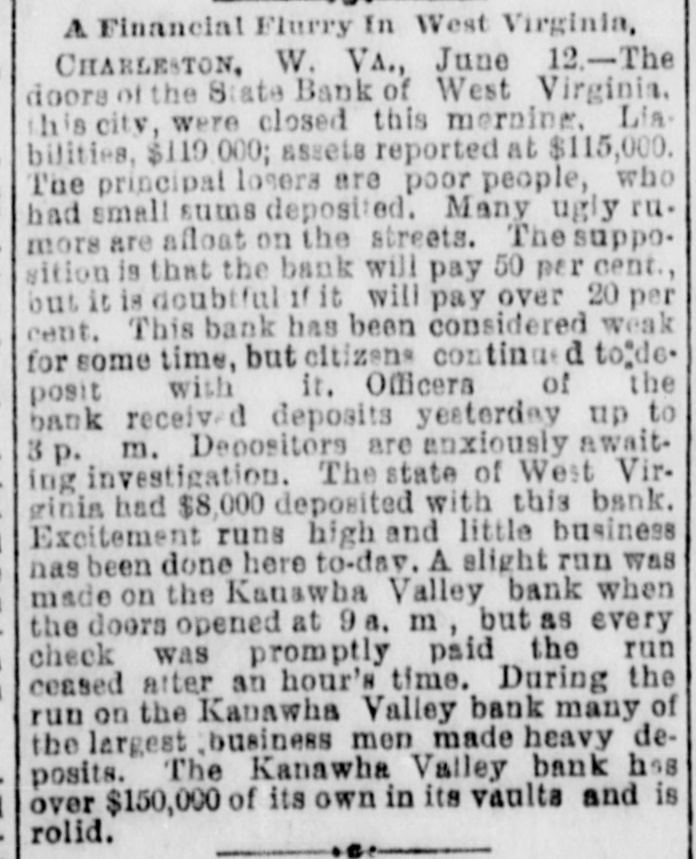 A Financial Flurry In West Virginia, CHARLESTON. W. VA., June 12.-The doors of the State Bank of West Virginia. this city, were closed this merning. Lia. bilities, $119 000; assets reported at $115,000. The principal losera are poor people, who had small sums deposited. Many ugly ru. mors are afloat on the streets. The supposition is that the bank will pay 50 per cent., but it is doubtful If it will pay over 20 per cent. This bank has been considered weak for some time, but citizens continue d to:de. posit with it. Officers of the bank received deposits yesterday up to p. m. Depositors are anxiously await. ing investigation. The state of West Virginia had $8,000 deposited with this bank. Excitement runs high and little business has been done here to-day. A slight run was made on the Kanawha Valley bank when the doors opened at 9a. m, but as every check was promptly paid the run ceased after an hour's time. During the run on the Kanawha Valley bank many of the largest business men made heavy deposits. The Kanawha Valley bank has over $150,000 of its own in its vaulta and is rolid.