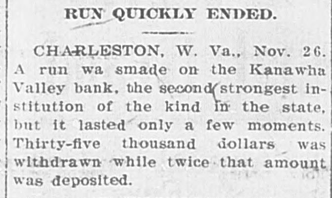 RUN QUICKLY ENDED. CHARLESTON, W. Va., Nov. 26. A run wa smade on the Kanawha Valley bank, the second(strongest institution of the kind in the state, but it lasted only a few moments. Thirty-five thousand dollars was withdrawn while twice that amount was deposited.