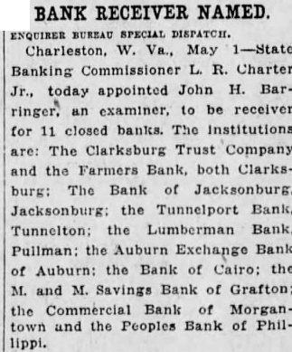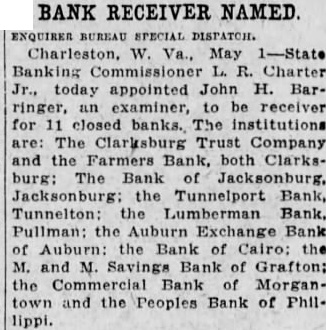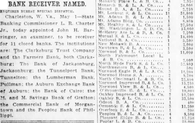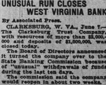 UNUSUAL RUN CLOSES WEST VIRGINIA BANK By Associated Press. CLA RKSBURG, W. VA., June :The Clarksburg Trust Company. with resources more than $2,000,000 and deposits of $1,500,000, was The Board of Directors announced It the company over to the State Banking Commission because of "unusual" withdrawals of funds during the last ten days. The commission said the company. would reopen in about two weeks.