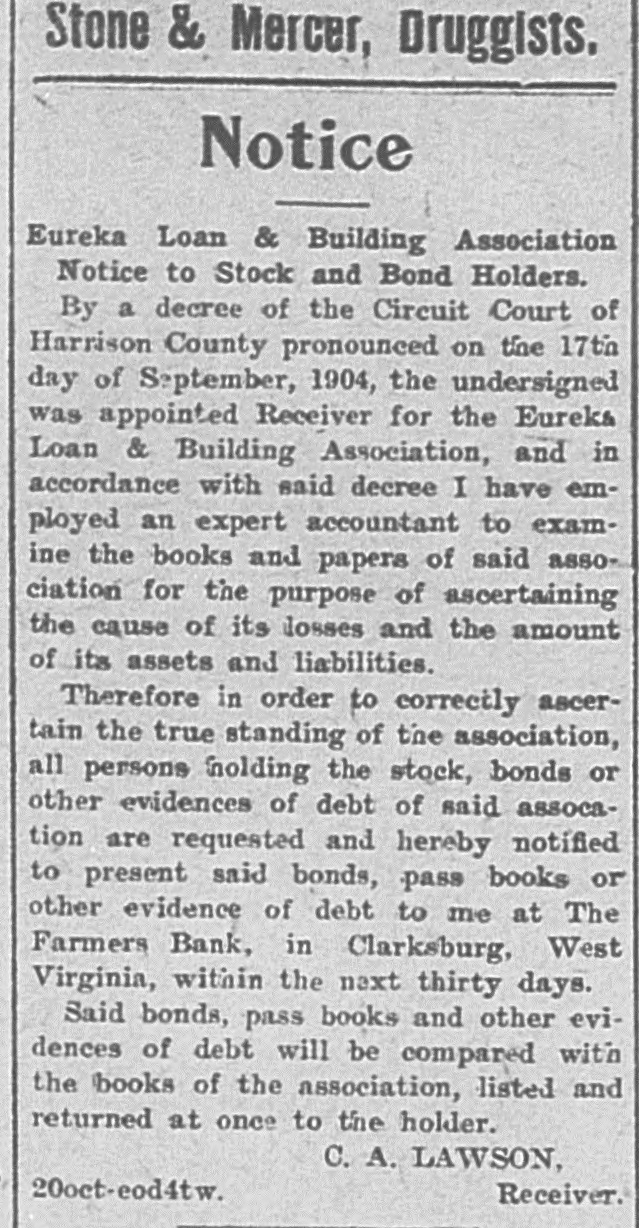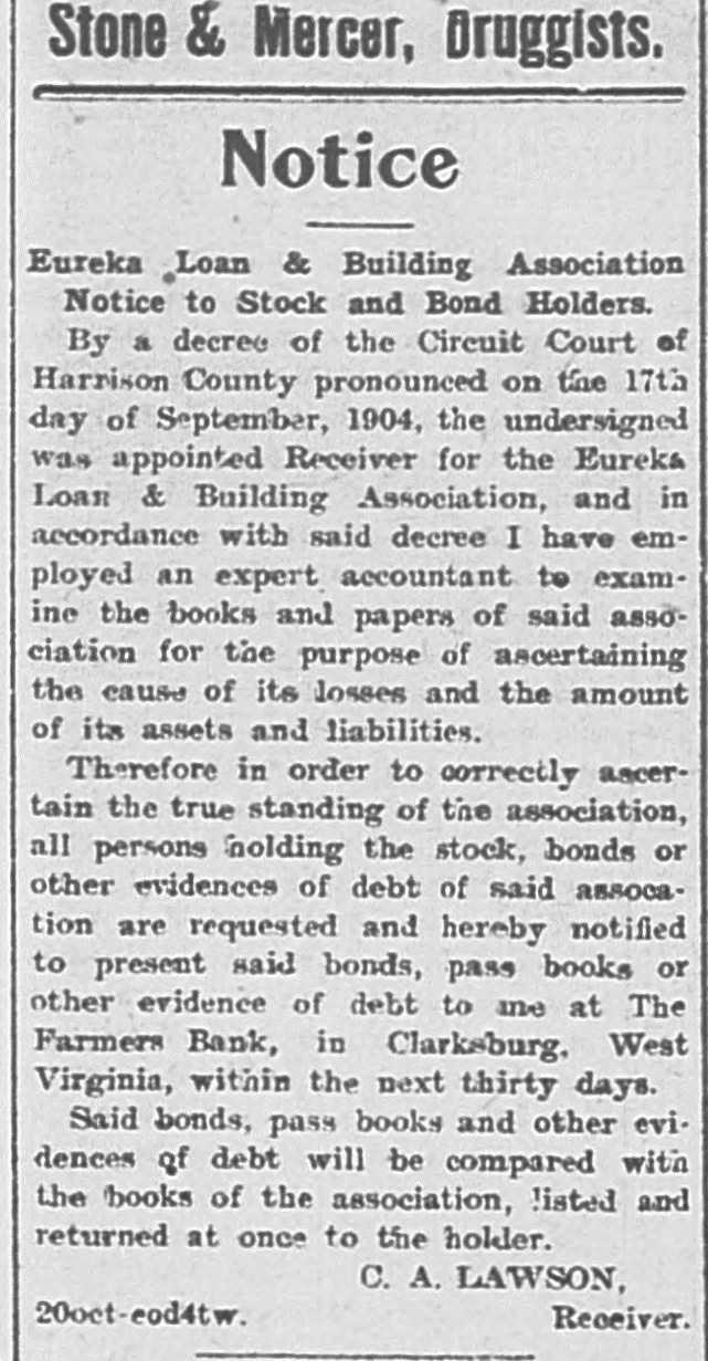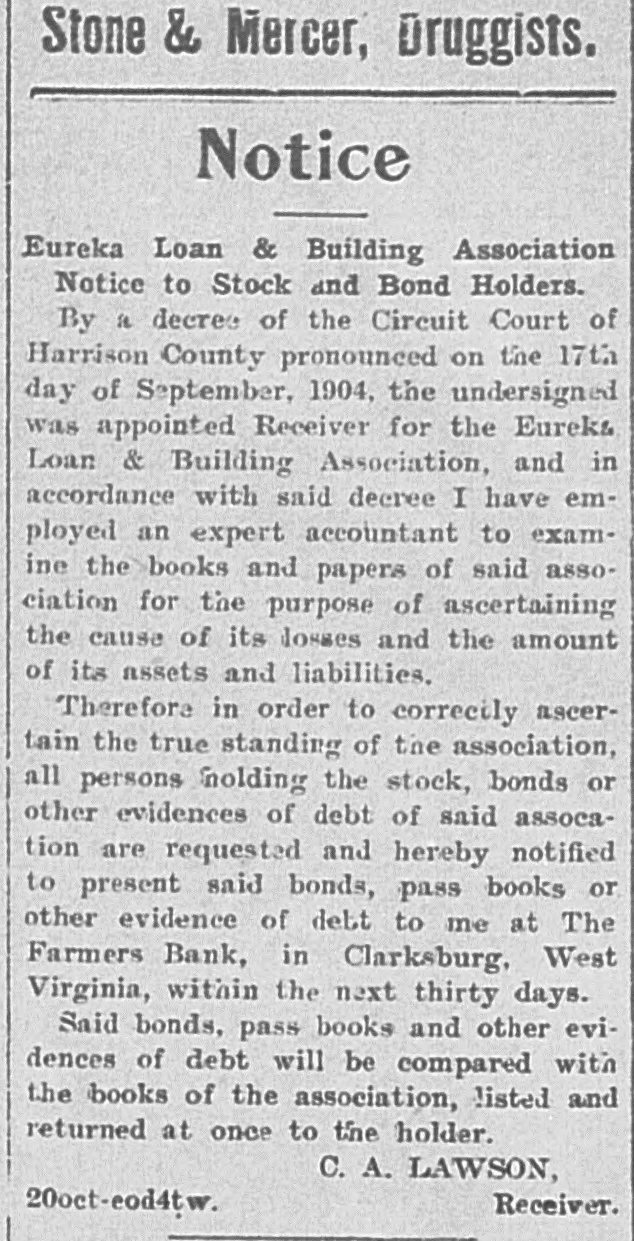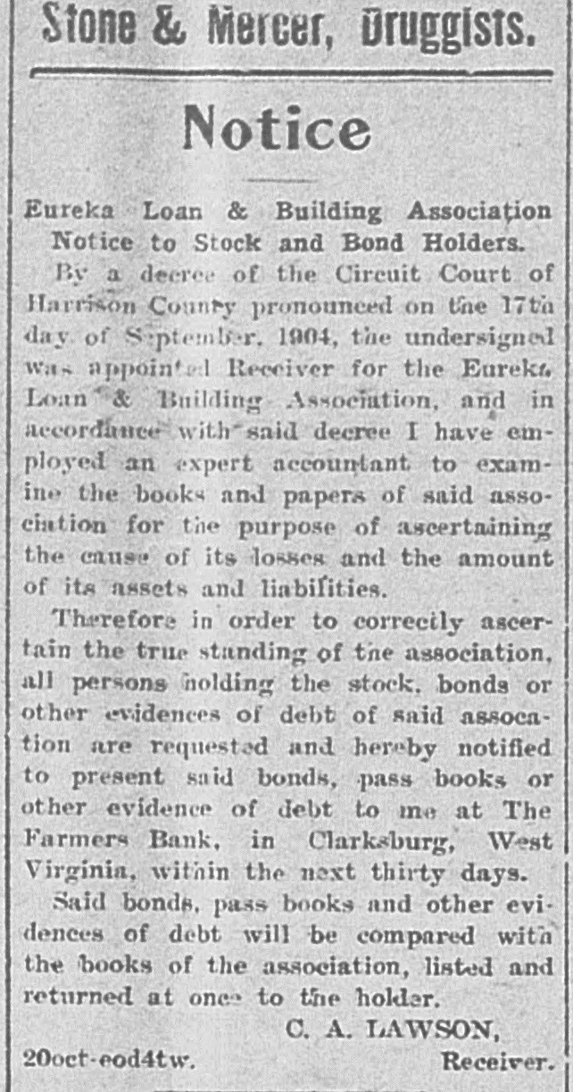 Notice Eureka Loan & Building Association Notice to Stock and Bond Holders. By a decree of the Circuit Court of Harrison County pronounced on the 17th day of September, 1904, the undersigned was appointed Receiver for the Eureka Loan & Building Association, and in accordance with said decree I have employed an expert accountant to examine the books and papers of said association for the purpose of ascertaining the cause of its losses and the amount of its assets and liabilities. Therefore in order to correctly ascertain the true standing of the association, all persons holding the stock, bonds or other evidences of debt of said assocation are requested and hereby notified to present said bonds, pass books or other evidence of debt to me at The Farmers Bank, in Clarksburg, West Virginia, within the next thirty days. Said bonds; pass books and other evidences of debt will be compared with the books of the association, listed and returned at once to the holder. C. A. LAWSON, Receiver. 20oct-eod4tw.