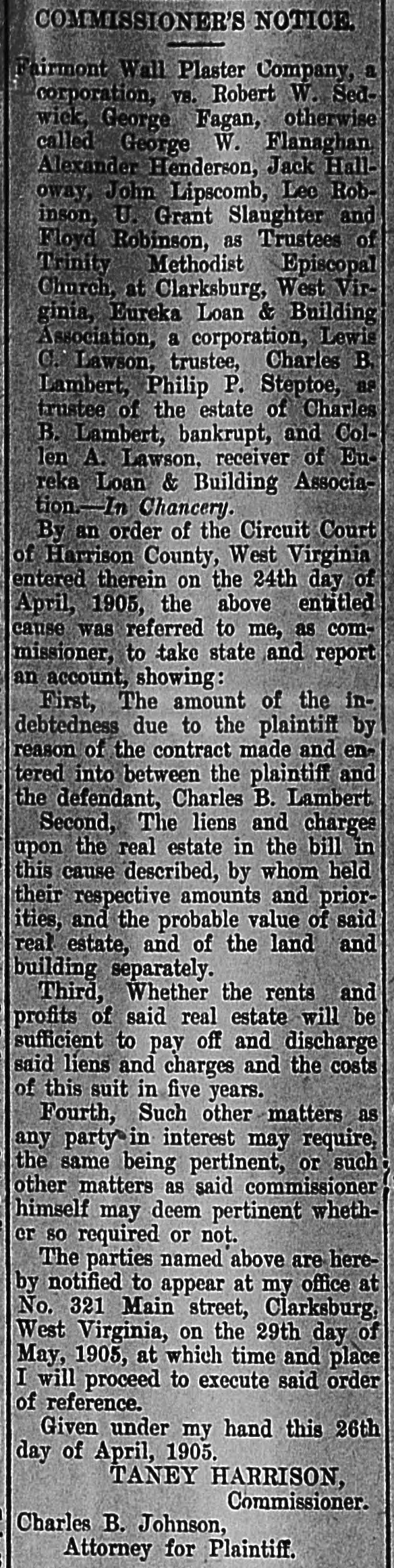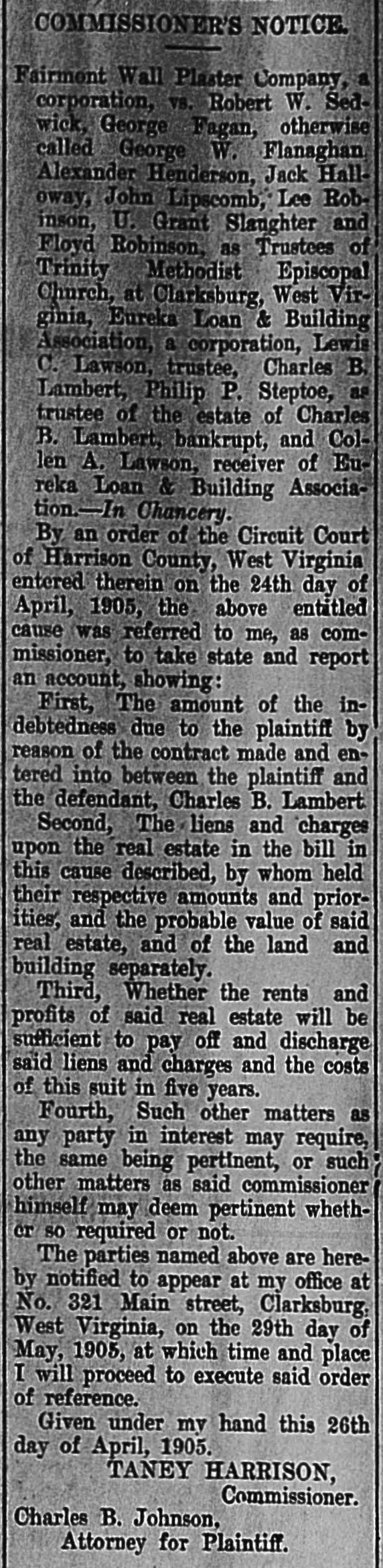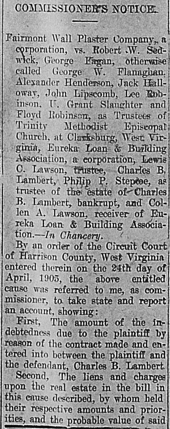 Notice Eureka Loan & Building Association Notice to Stock and Bond Holders. By a decree of the Circuit Court of Harrison County pronounced on the 17th day of September, 1904, the undersigned was appointed Receiver for the Eureka Loan & Building Association, and in accordance with said decree I have employed an expert accountant to examine the books and papers of said association for the purpose of ascertaining the cause of its losses and the amount of its assets and liabilities. Therefore in order to correctly ascertain the true standing of the association, all persons holding the stock, bonds or other evidences of debt of said assocation are requested and hereby notified to present said bonds, pass books or other evidence of debt to me at The Farmers Bank, in Clarksburg, West Virginia, within the next thirty days. Said bonds; pass books and other evidences of debt will be compared with the books of the association, listed and returned at once to the holder. C. A. LAWSON, Receiver. 20oct-eod4tw.