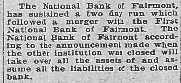The National Bank of Fairmont, has sustained a two day run which followed a merger with the First National Bank of Fairmont. The National Bank of Fairmont according to the announcement made when the other institution was closed will take over all the assets of and assume all the liabilities of the closed bank.