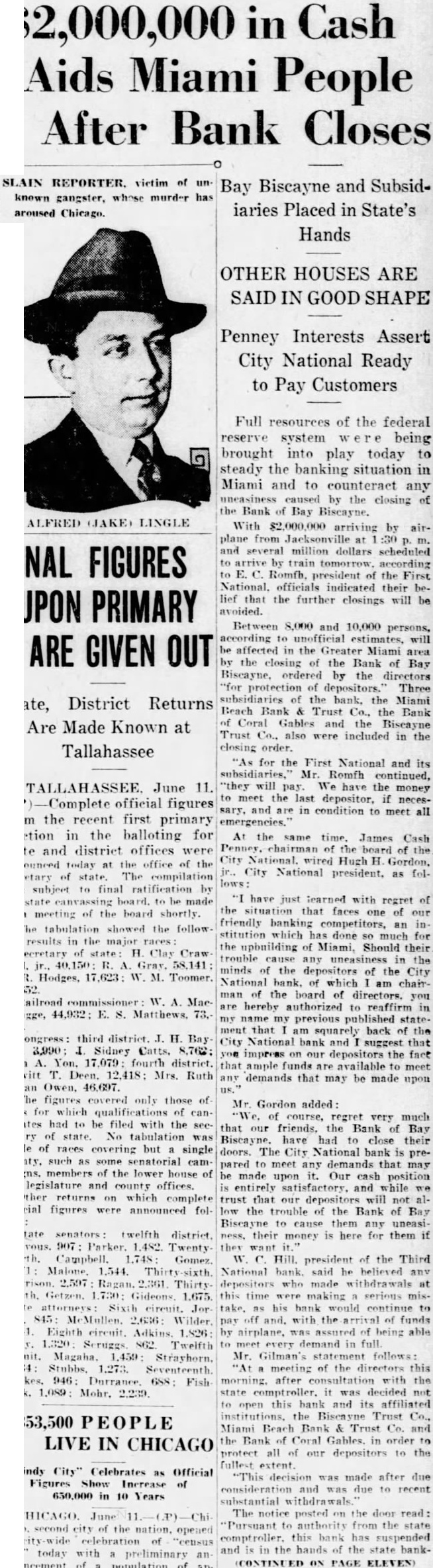 $2,000,000 in Cash Aids Miami People After Bank Closes SLAIN REPORTER. victim of unknown gangster, whose murder has aroused Chicago. Bay Biscayne and Subsidiaries Placed in State's Hands OTHER HOUSES ARE SAID IN GOOD SHAPE Penney Interests Assert City National Ready to Pay Customers Full resources of the federal reserve system being brought into play today to steady the banking situation in Miami and to counteract any by the closing of the Bank Bay Biscayne. With $2,000,000 arriving by airplane from Jacksonville and several million dollars scheduled train tomorrow. according E. Romfh. president the First National. officials their belief that the further closings will be avoided. Between 8,000 and 10,000 persons, according unofficial be affected in Greater Miami the closing of the Bank Bay Biscayne, ordered by the directors "for protection depositors. Three subsidiaries the bank, the Miami Beach Bank Trust Co., the Bank Coral Gables the Trust also were included in the closing order. "As for the First National and its subsidiaries, Mr. Romfh continued, "they will We have the money meet the last depositor, if necesand are in condition to meet all At the same time. James Cash the Hugh City National president, as folhave just learned with regret of the faces of our friendly competitors, an which the of Miami, Should their any the minds the the City National which am chairthe board directors. you are hereby authorized reaffirm in my previous published statement that am squarely back of the City National bank and suggest that impress depositors the fact that ample funds are available meet demands that may be made upon Mr. Gordon added of regret very much that our friends. the Bank Bay Biscayne. have had close their doors. The City National bank is prepared meet any demands that may be made upon cash position entirely satisfactory. and trust our althe trouble the Bank of Bay Biscayne any uneasitheir money is for them if they Hill. president of the Third National bank said made withdrawals at this time making serious take. his to pay with the funds by of being able every full. Mr. Gilman's follows: of the directors this after with the state bank and its affiliated the Biscayne Trust Miami Beach Bank Trust and the Bank Coral Gables. order protect all of our depositors to the fullest "This decision made after due consideration was due recent substantial withdrawals The notice posted the door read: "Pursuant authority from the comptroller. this bank has suspended and the hands the state bankON PAGE ELEVEN)