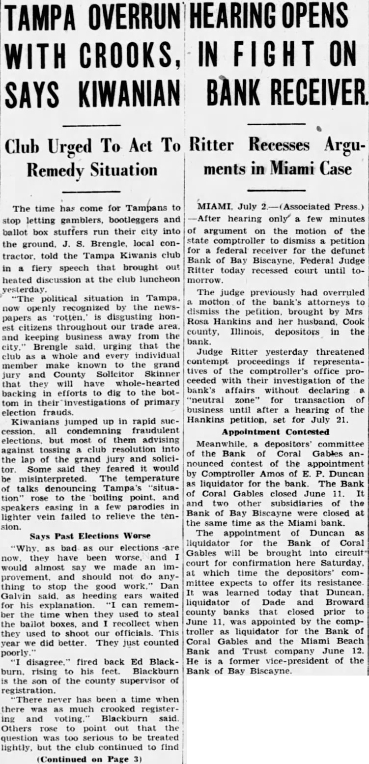 TAMPA OVERRUN IN ON CROOKS, BANK RECEIVER. KIWANIAN To Act To Ritter Recesses Club Urged ArguSituation in Miami ments Remedy The time has come for Tampans stop letting gamblers, bootleggers and ballot box stuffers run their city into the Brengle, local contractor. told the Tampa Kiwanis club fiery speech that brought out heated discussion the club luncheon political situation Tampa, recognized the papers rotten. disgusting honcitizens throughout our trade keeping business away from Brengle that whole and every individual member make known grand Skinner that backing efforts dig the tom primary frauds. Kiwanians jumped up in rapid sucmost them advising against club into the grand jury and soliciSome they would The talks Tampa's "situarose the point, speakers parodies lighter vein failed to relieve the ten- Says Past Elections Worse bad our elections have been would almost made should do thing good Dan heeding ears waited they used steal ballot boxes, and recollect used shoot This did better. They just counted poorly fired back Ed Blackrising feet. the the county supervisor registration. been time when there much crooked and voting. Others point out the too be treated lightly, the club to find (Continued Page hearing few minutes argument the motion of the state comptroller dismiss petition for federal receiver for the defunct Bank Bay Federal Judge Ritter today recessed court until tomorrow. The judge previously had overruled motion bank's attorneys dismiss the petition. brought by Mrs Rosa and her Cook county, Illinois, depositors in the Judge Ritter yesterday threatened representacomptroller's office ceeded the bank's affairs without declaring "neutral for transaction business after hearing of the Hankins petition. set for July 21. Appointment Contested Meanwhile, depositors committee the Bank Coral Gables nounced contest the appointment Comptroller Amos of Duncan liquidator the bank. The Bank Coral Gables closed June 11. and two other subsidiaries the Bank Bay Biscayne closed the same time Miami bank. The appointment Duncan liquidator for Bank Coral Gables brought circuit court for confirmation here Saturday, which time depositors committee expects offer its resistance learned today Duncan. liquidator Dade Broward county June by the troller for Bank Coral and the Miami Beach Bank and Trust June He of the Bank of Bay Biscayne.