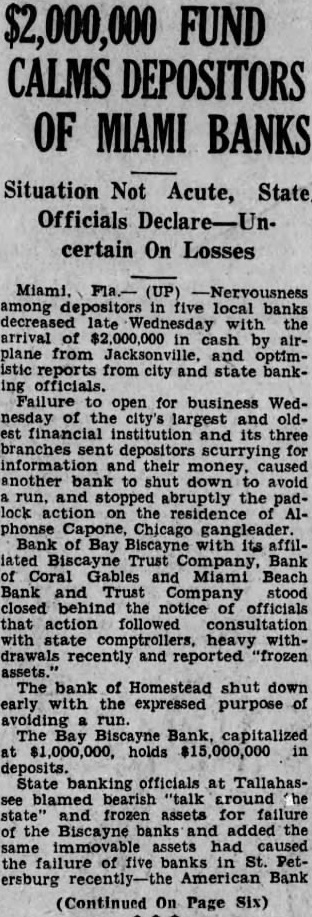 Millions Sent To Miami Banks from Page clined to give later figures as to the bank's approximation of the amount of recent withdrawals. Capital stock was listed surplus profits at statement issued by the subsidiaries same time, the Biscayne Trust company was listed having $1,520,041 deposits and resources. Miami Beach Bank Trust company showed $2,349,943 deposits and $2, The Bank Coral Gables listed deposits of $606,of Withdrawals Are Heavy Heavy withdrawals reported by other banks of the city, but the arrival of in cash by airplane from Jacksonville depository Reserve bank this by Gov. R. Black of the Federal Reserve bank that total $6,000,000 in route banks to allay fears of depositors before President E. C. Romfh of the First National bank, said his had paid out $500,000 large today, and that cash was available meet all demands. The First closed at its regular o'clock The City National bank open after its reqular closing hour give depositors money they chose. President Hugh Gordon, withdrawals had and that funds were for all Flies To Miami Creed of the Federal bank this district here today by airplane from Tampa. went conferthe of Bay the Arthur W. Saarinen, banking took affairs of the closed bank formal from President Gilman the of the this with the was not the open this bank and its affiliated the pany, Miami and Trust comthe Bank of all order of our deposthe fullest extent. "This made after due consideration, was due to recent substantial withdrawals.' It was estimated that between 8,000 and affected of the Miami area banks. L. Chandler, chairman of the of the bank, said the had been closed measure in order to prevent run. APPOINTED Appointment Duncan of Miami, for Dade Broward the five banks which failed Dade county today was by Comptroller ErAmos Four of the banks-the Bank of Bay Biscayne Trust company, Miami Beach Bank and Trust company, Bank Coral Gables -suspended during forenoon. later department the the Fla., which capitalized $35,000.