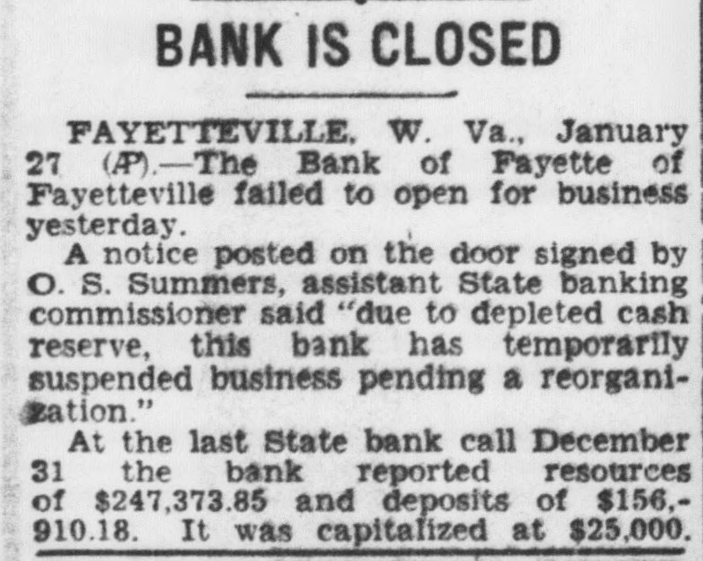 BANK IS CLOSED FAYETTEVILLE. W. Va., January 27 (AP)-The Bank of Fayette of Fayetteville failed to open for business yesterday. A notice posted on the door signed by O. S. Summers, assistant State banking commissioner said "due to depleted cash reserve, this bank has temporarily suspended business pending a reorganization." At the last State bank call December 31 the bank reported resources of $247,373.85 and deposits of $156,910.18. It was capitalized at $25,000.