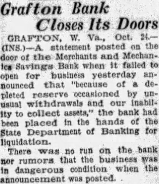 Grafton Bank Closes Its Doors GRAFTON, W. Va., Oct. statement posted on the door of the Merchants and MechanIca Savings Bank when it failed to open for business yesterday announced that "because of depleted reserve occasioned by unusual withdrawals and our inability to collect assets," the bank had been placed in the hands of the State Department of Banking for liquidation. There was no run on the bank nor rumors that the business was in dangerous condition when the announcement was posted.