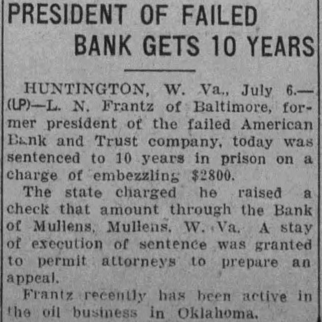 PRESIDENT OF FAILED BANK GETS 10 YEARS HUNTINGTON. W. Va., July (LP)-L. Frantz of former of the failed American Bank and Trust company. today was sentenced years prison on $2800 The charged raised that amount the Bank Mullens, Mullens. stay execution granted permit attorneys prepare an appeal. Frantz recently has been active business in Oklahoma.
