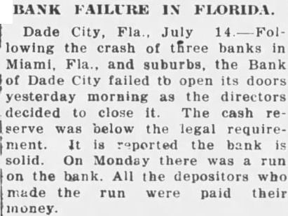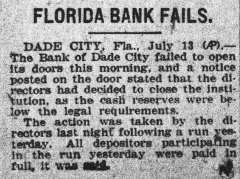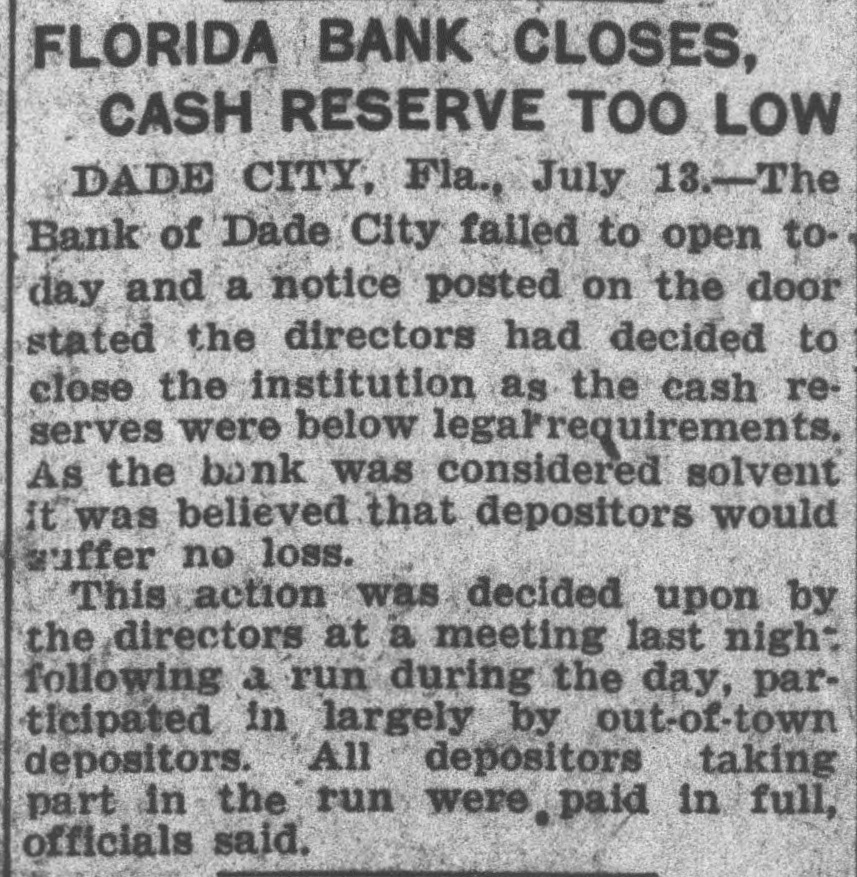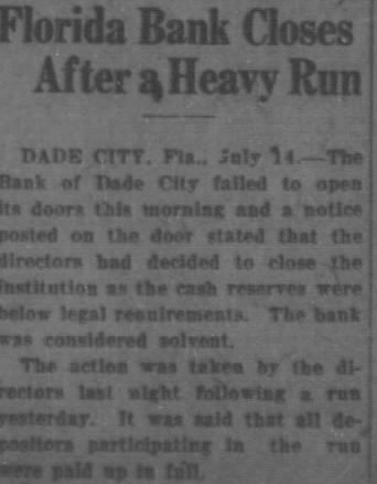 DADE CITY, July Tribune News Service.) decision of the board of directors of the Bank of Dade City close the bank the run cording to statement made by the president. M. Williams, because the system with which the bank is affillated. not able to help, for the first in years that Mr. Williams has connected with