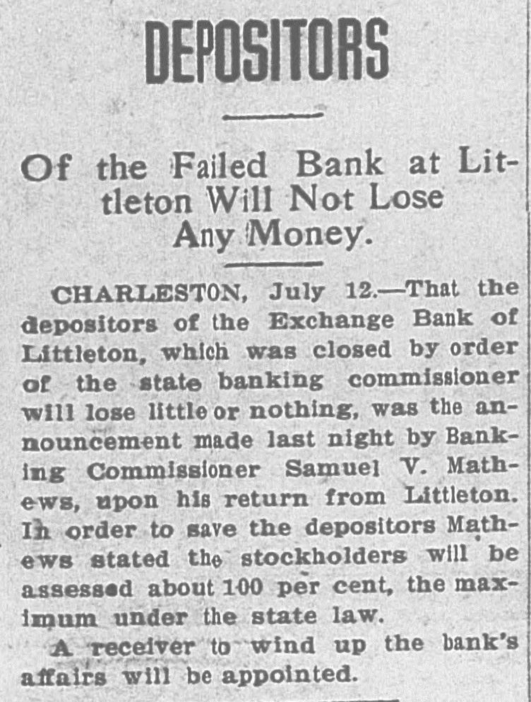 DEPOSITORS Of the Failed Bank at Littleton Will Not Lose Any Money. CHARLESTON, July 12.-That the depositors of the Exchange Bank of Littleton, which was closed by order of the state banking commissioner will lose little or nothing, was the announcement made last night by Banking Commissioner Samuel V. Mathews, upon his return from Littleton. In order to save the depositors Mathews stated the stockholders will be assessed about 100 per cent, the maximum under the state law. A receiver to wind up the bank's affairs will be appointed.