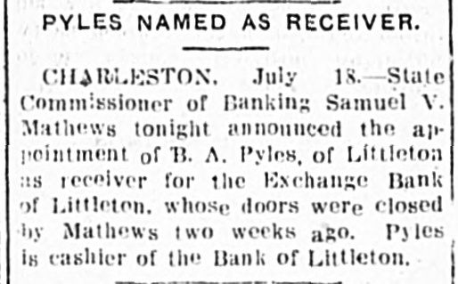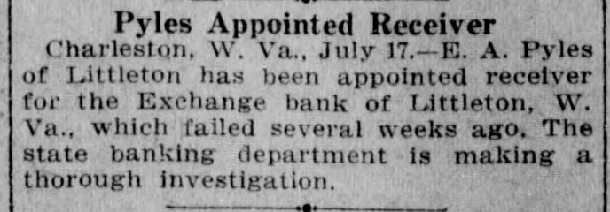 PYLES NAMED AS RECEIVER Special Dispatch to the Intelligencer CHARLESTON W. Va., July 17.State Commissioned of Banking Samuel V. Mathews to-night announced the appointment of B A. Pyles, of Littleton as receiver for the Ex. change Bank of Littleton, whose doors were closed by Mathews two weeks ago Pyles is cashier of the Bank as Littleton,