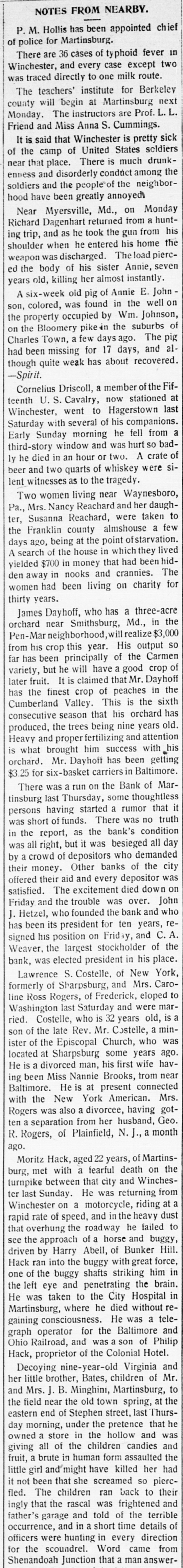 NOTES FROM NEARBY. P. M. Hollis has been appointed chief of police for Martinsburg. There are 36 cases of typhoid fever in Winchester, and every case except two was traced directly to one milk route. The teachers' institute for Berkeley county will begin at Martinsburg next Monday. The instructors are Prof. L. L. Friend and Miss Anna S. Cummings. It is said that Winchester is pretty sick of the camp of United States soldiers near that place. There is much drunkenness and disorderly conduct among the soldiers and the people of the neighborhood have been greatly annoyed Near Myersville, Md., on Monday Richard Dagenhart returned from a hunting trip, and as he took the gun from his shoulder when he entered his home the weapon was discharged. The load pierced the body of his sister Annie, seven years old, killing her almost instantly. A six-week old pig of Annie E. John son, colored, was found in the well on the property occupied by Wm. Johnson, on the Bloomery pike in the suburbs of Charles Town, a few days ago. The pig had been missing for 17 days, and although quite weak has about recovered. -Spirit. Cornelius Driscoll, a member of the Fifteenth U. S. Cavalry, now stationed at Winchester, went to Hagerstown last Saturday with several of his companions. Early Sunday morning he fell from a third-story window and was hurt so badly he died in an hour or two. A crate of beer and two quarts of whiskey were silent witnesses as to the tragedy. Two women living near Waynesboro, Pa., Mrs. Nancy Reachard and her daughter, Susanna Reachard, were taken to the Franklin county almshouse a few days ago, being at the point of starvation. A search of the house in which they lived yielded $700 in money that had been hidden away in nooks and crannies. The women had been living on charity for thirty years. James Dayhoff, who has a three-acre orchard near Smithsburg, Md., in the Pen-Mar neighborhood, will realize $3,000 from his crop this year. His output so far has been principally of the Carmen variety, but he will have a good crop of later fruit. It is claimed that Mr. Dayhoff has the finest crop of peaches in the Cumberland Valley. This is the sixth consecutive season that his orchard has produced, the trees being nine years old. Heavy and proper fertilizing and attention is what brought him success with his orchard. Mr. Dayhoff has been getting $3.25 for six-basket carriers in Baltimore. There was a run on the Bank of Martinsburg last Thursday, some thoughtless persons having started a rumor that it was short of funds. There was no truth in the report, as the bank's condition was all right, but it was besieged all day by a crowd of depositors who demanded their money. Other banks of the city offered their aid and every depositor was satisfied. The excitement died down on Friday and the trouble was over. John J. Hetzel, who founded the bank and who has been its president for ten years, resigned his position on Friday, and C.A. Weaver, the largest stockholder of the bank, was elected president in his place. Lawrence S. Costelle, of New York, formerly of Sharpsburg, and Mrs. Caroline Ross Rogers, of Frederick, eloped to Washington last Saturday and were married. Costelle, who is 32 years old, is a son of the late Rev. Mr. Costelle, a minister of the Episcopal Church, who was located at Sharpsburg some years ago. He is a divorced man, his first wife having been Miss Nannie Brooks, from near Baltimore. He is at present connected with the New York American. Mrs. Rogers was also a divorcee, having gotten a separation from her husband, Geo. R. Rogers, of Plainfield, N. J., a month ago. Moritz Hack, aged 22 years, of Martinsburg, met with a fearful death on the turnpike between that city and Winches-
