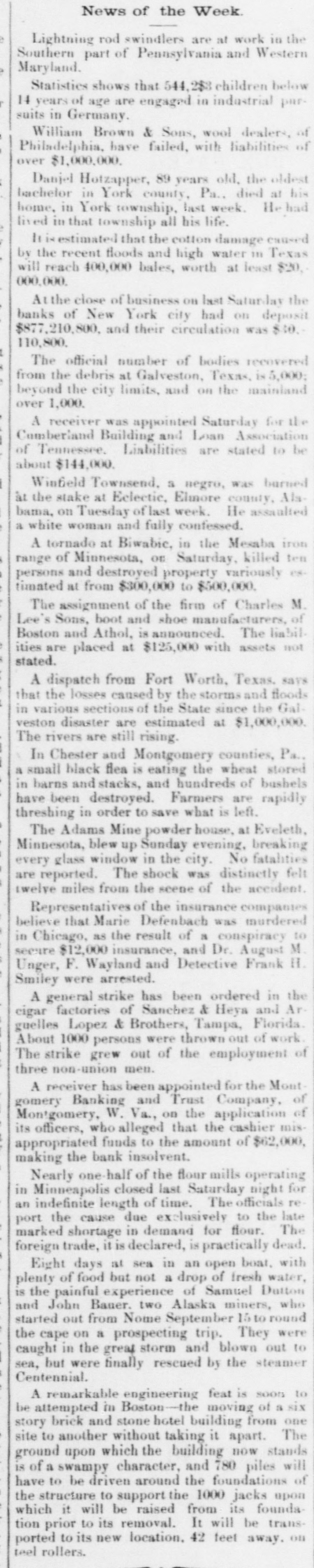 News of the Week. Lightning rod swindlers are at work in the Southern part of Pennsylvania and Western Maryland. Statistics shows that 544,2$8 children below 14 years of age are engaged in industrial pursuits in Germany. William Brown & Sons, wool dealers, of Philadelphia, have failed, with liabilities of over $1,000,000. Danjel Hotzapper, 89 years old, the oldest bachelor in York county, Pa., died at his home, in York township, last week. He had lived in that township all his life. II is estimated that the cotton damage caused by the recent floods and high water in Texas will reach 400,000 bales, worth at least $20, 000,000. Atthe close of business on last Saturday the banks of New York city had on deposit $877,210,800. and their circulation was $10. 110,800. The official number of bodies recovered from the debris at Galveston, Texas, is 5,000; beyond the city limits, and on the mainland over 1,000. A receiver was appointed Saturday for the Cumberland Building and Loan Association of Tennessee. Liabilities are stated to be about $144,000. Winfield Townsend. a negro, was burned at the stake at Eelectic, Elmore county, Alsbama, on Tuesday of last week. He assaulted a white woman and fully confessed. A tornado at Biwabic, in the Mesaba iron range of Minnesota, or Saturday, killed ten persons and destroyed property variously estimated at from $300,000 to $500,000. The assignment of the firm of Charles M. Lee's Sons, boot and shoe manufacturers, of Boston and Athol, is announced. The liabil ities are placed at $125,000 with assets not stated. A dispatch from Fort Worth. Texas. says that the losses caused by the storms and floods in various sections of the State since the Galveston disaster are estimated at $1,000,000. The rivers are still rising. In Chester and Montgomery counties, Pa., a small black flea is eating the wheat stored in barns and stacks, and hundreds of bushels have been destroyed. Farmers are rapidly threshing in order to save what is left. The Adams Mine powder house, at Eveleth, Minnesota, blew up Sunday evening, breaking every glass window in the city. No fatalities are reported. The shock was distinctly felt twelve miles from the scene of the accident. Representatives of the insurance companies believe that Marie Defenbach was murdered in Chicago, as the result of a conspiracy to secure $12,000 insurance, and Dr. August M. Unger, F. Wayland and Detective Frank H. Smiley were arrested. A general strike has been ordered in the cigar factories of Sanchez & Heya and Ar. guelles Lopez & Brothers, Tampa, Florida. About 1000 persons were thrown out of work The strike grew out of the employment of three non-union men. A receiver has been appointed for the Mont gomery Banking and Trust Company, of Montgomery, W. Va., on the application of its officers, who alleged that the cashier misappropriated funds to the amount of $62,000, making the bank insolvent. Nearly one-half of the flour mills operating in Minneapolis closed last Saturday night for an indefinite length of time. The officials report the cause due exclusively to the late marked shortage in demand for flour. The foreign trade, it is declared, is practically dead. Eight days at sea in an open boat. with plenty of food but not a drop of fresh water, is the painful experience of Samuel Dutton and John Bauer. two Alaska miners, who started out from Nome September 15 to round the cape on a prospecting trip. They were caught in the great storm and blown out to sea, but were finally reseued by the steamer Centennial. A remarkable engineering feat is soon to be attempted in Boston-the moving of a six story brick and stone hotel building from one site to another without taking it apart. The ground upon which the building now stands is of a swampy character, and 780 piles will
