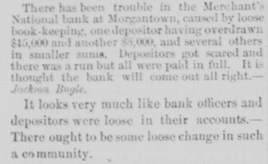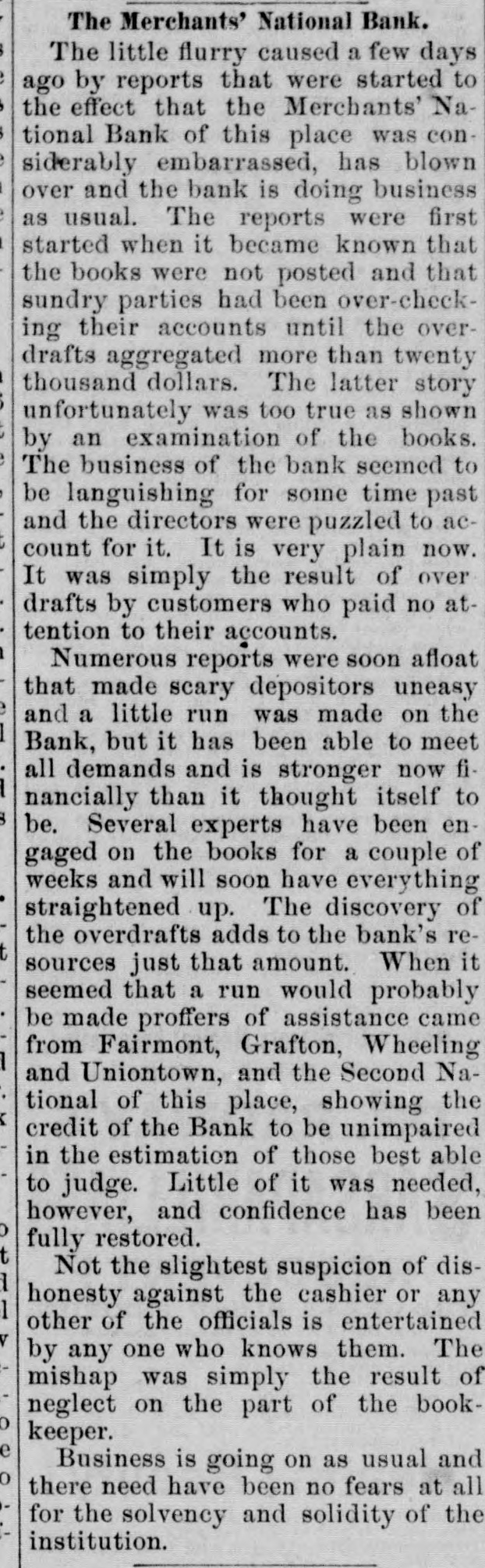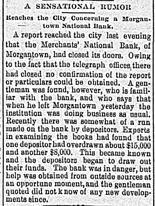 A SENSATIONAL RUMOR Reaches the City Concerning n Morgan. town National Bank. A report reached the city last evening that the Merchants' National Bank, of Morgantown, had closed its doors. Owing to the fact that the telegraph offices, there had closed no ! confirmation of the report or particulars could be obtained. A gentleman was found, however, who is familiar with the bank, and who says that when he left Morgantown yesterday the institution was doing business as usual. Recently there was somewhat of a run made on the bank by depositors. Exports in examining the books had found that one depositor had overdrawn about $15,000 and another $8,000. This became known and the depositors began to draw out their funds. The bank was in danger, but help was obtained from outside sources at an opportune moment, and the gentleman quoted did not k now of any new developments since.