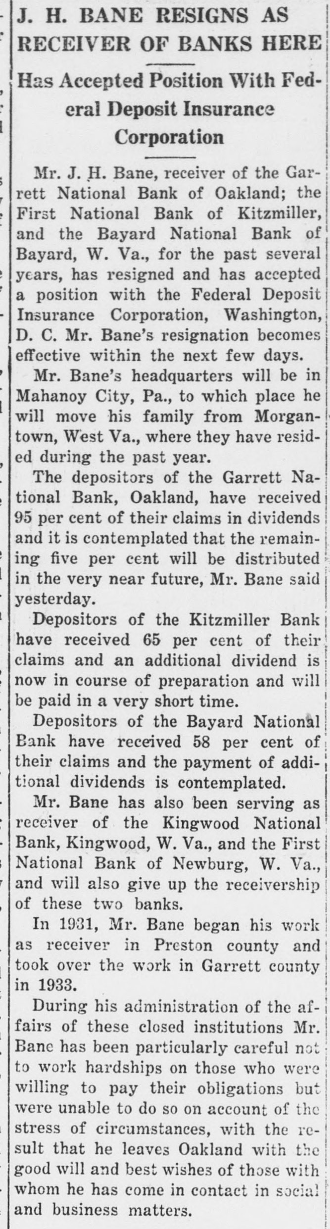 J. H. BANE RESIGNS AS RECEIVER OF BANKS HERE Has Accepted Position With Federal Deposit Insurance Corporation Mr. J. H. Bane, receiver of the Garrett National Bank of Oakland; the First National Bank of Kitzmiller, and the Bayard National Bank of Bayard, W. Va., for the past several years, has resigned and has accepted a position with the Federal Deposit Insurance Corporation, Washington, D. C. Mr. Bane's resignation becomes effective within the next few days. Mr. Bane's headquarters will be in Mahanoy City, Pa., to which place he will move his family from Morgantown, West Va., where they have resided during the past year. The depositors of the Garrett National Bank, Oakland, have received 95 per cent of their claims in dividends and it is contemplated that the remaining five per cent will be distributed in the very near future, Mr. Bane said yesterday. Depositors of the Kitzmiller Bank have received 65 per cent of their claims and an additional dividend is now in course of preparation and will be paid in a very short time. Depositors of the Bayard National Bank have received 58 per cent of their claims and the payment of additional dividends is contemplated. Mr. Bane has also been serving as receiver of the Kingwood National Bank, Kingwood, W. Va., and the First National Bank of Newburg, W. Va., and will also give up the receivership of these two banks. In 1931, Mr. Bane began his work as receiver in Preston county and took over the work in Garrett county in 1933. During his administration of the affairs of these closed institutions Mr. Bane has been particularly careful not to work hardships on those who were willing to pay their obligations but were unable to do SO on account of the stress of circumstances, with the result that he leaves Oakland with the good will and best wishes of those with whom he has come in contact in social and business matters.