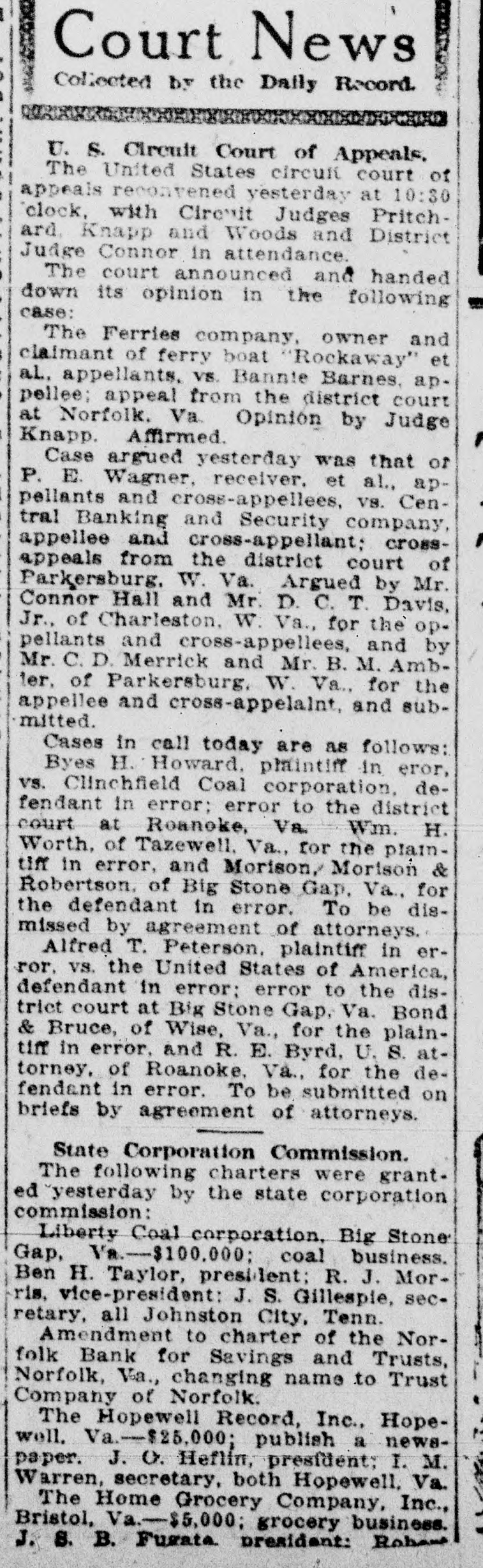 Court News Collected by the Daily Record. U. S. Circuit Court of Appeals. The United States circuit court of appeals reconvened yesterday at 10:30 clock, with Circuit Judges Pritchard. Knapp and Woods and District Judge Connor in attendance. The court announced and handed down its opinion in the following case: The Ferries company, owner and claimant of ferry boat "Rockaway" et al. appellants, VS. Bannie Barnes. appellee; appeal from the district court at Norfolk. Va. Opinion by Judge Knapp. Affirmed. Case argued yesterday was that of P. E. Wagner, receiver. et al., appellants and cross-appellees, vs. Central Banking and Security company, appellee and cross-appellant; crossappeals from the district court of Parkersburg. W. Va. Argued by Mr. Connor Hall and Mr. D. C. T. Davis, Jr., of Charleston. W. Va., for the op. pellants and cross-appellees, and by Mr. C. D. Merrick and Mr. B. M. Ambler, of Parkersburg. W. Va., for the appellee and cross-appelalnt, and submitted. Cases in call today are as follows: Byes H. Howard. plaintiff in eror, vs. Clinchfield Coal corporation. defendant in error; error to the district court at Roanoke, Va. Wm. H. Worth, of Tazewell. Va., for the plaintiff in error, and Morison, Morison & Robertson. of Big Stone Gap. Va., for the defendant in error. To be dismissed by agreement of attorneys. Alfred T. Peterson. plaintiff in error. vs. the United States of America, defendant in error: error to the distriet court at Big Stone Gap, Va. Bond & Bruce, of Wise, Va., for the plaintiff in error, and R. E. Byrd, U. S. attorney, of Roanoke. Va., for the defendant in error. To be submitted on briefs by agreement of attorneys. State Corporation Commission. The following charters were granted yesterday by the state corporation commission: Liberty Coal corporation. Big Stone Gap, Va.-$100,000; coal business. Ben H. Taylor, president: R. J. Morris, vice-president: J. S. Gillespie, secretary, all Johnston City, Tenn. Amendment to charter of the Norfolk Bank for Savings and Trusts, Norfolk, Va., changing name to Trust Company of Norfolk. The Hopewell Record, Inc., Hopewell. Va.-$25,000; publish a newspaper. J. O. Heflin, president: I. M. Warren, secretary, both Hopewell, Va. The Home Grocery Company, Inc., Bristol, Va.-$5,000; grocery business. J. 8. B. Fugate president: Robert
