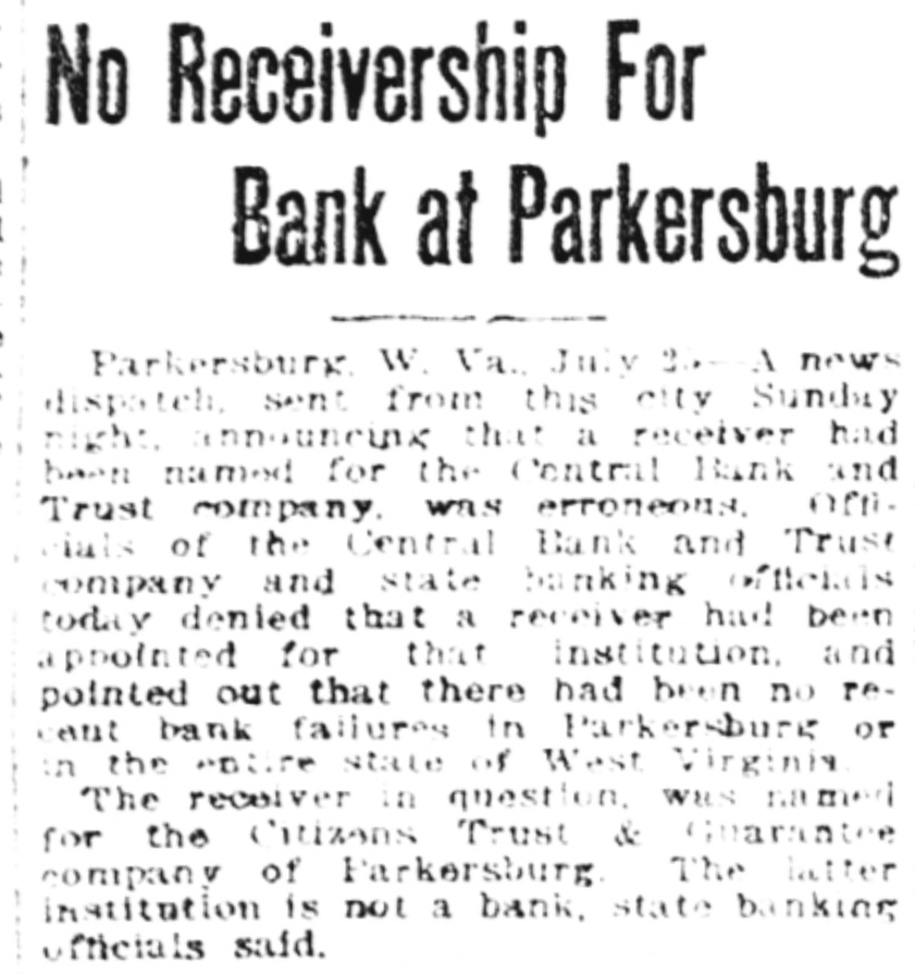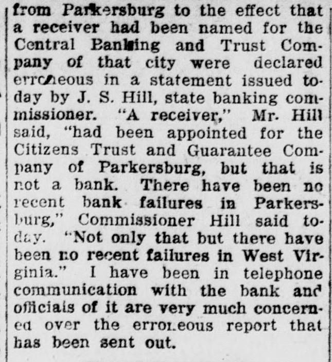 from Parkersburg to the effect that a receiver had been named for the Central Panking and Trust Company of that city were declared erroneous in a statement issued today by J. S. Hill, state banking commissioner. "A receiver," Mr. Hill said, "had been appointed for the Citizens Trust and Guarantee Company of Parkersburg, but that is not a bank. There have been no recent bank failures in Parkersburg," Commissioner Hill said today. "Not only that but there have been no recent failures in West Virginia." I have been in telephone communication with the bank and officiais of it are very much concerned over the erroreous report that has been sent out.