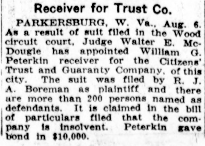 Receiver for Trust Co. PARKERSBURG, W. Va., Aug. 6. As a result of suit filed in the Wood circuit court, Judge Walter E. McDougle has appointed William G. Peterkin receiver for the Citizens' Trust and Guaranty Company, of this city. The suit was filed by R. J. A. Boreman as plaintiff and there are more than 200 persons named as defendants. It is claimed in the bill of particulars filed that the company is insolvent. Peterkin gave bond in $10,000.