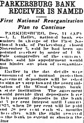 PARKERSBURG BANK RECEIVER IS NAMED First National Reorganization Plan to Continue PARKERSBURG Dec. 11 (AP) pointed neiver by order of " Pole comptroller of the currency not hinder am plan of tion of mutual proto tion Fation of the Wood County bank R institution The ment would provide that depositors 1. their present deposits In the bank At cent Interest until the bink to extend 01 shorten the time