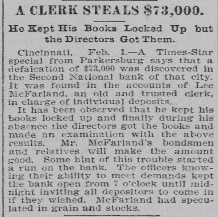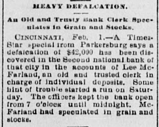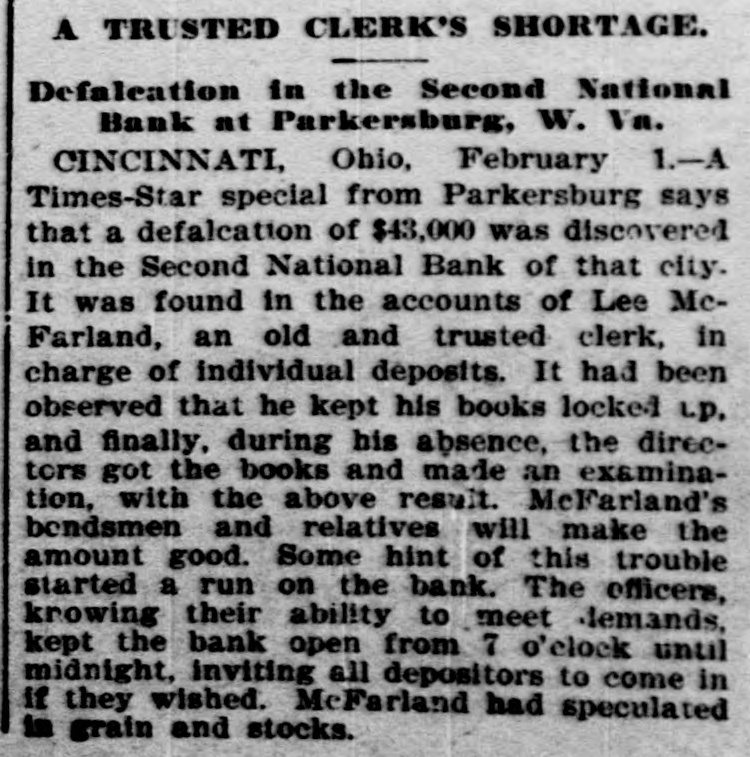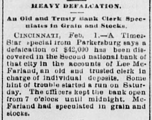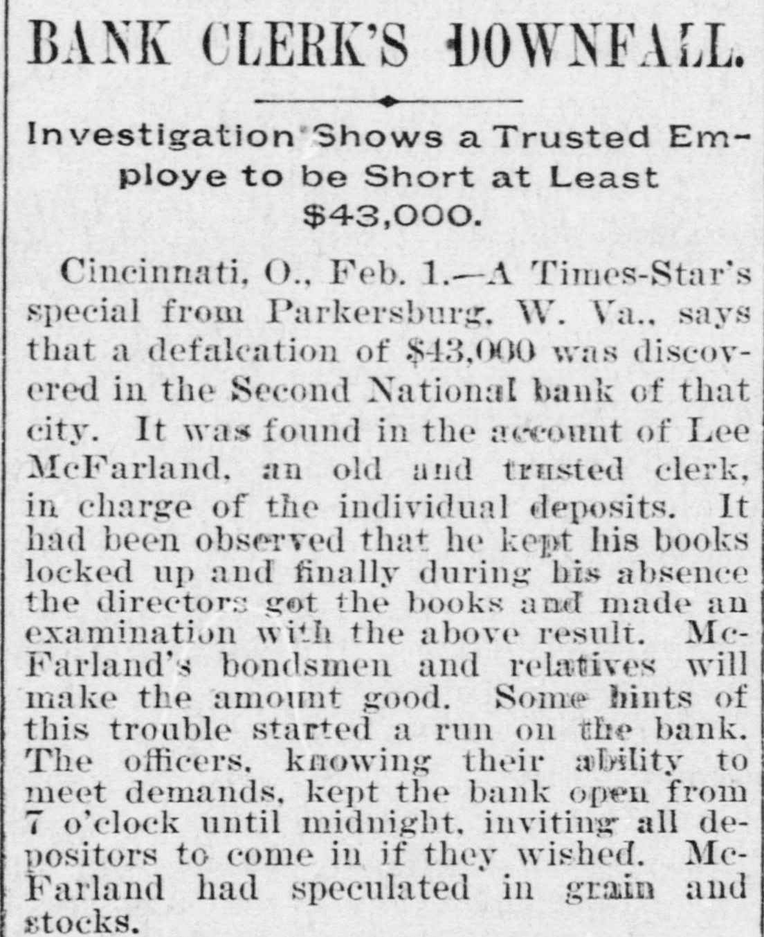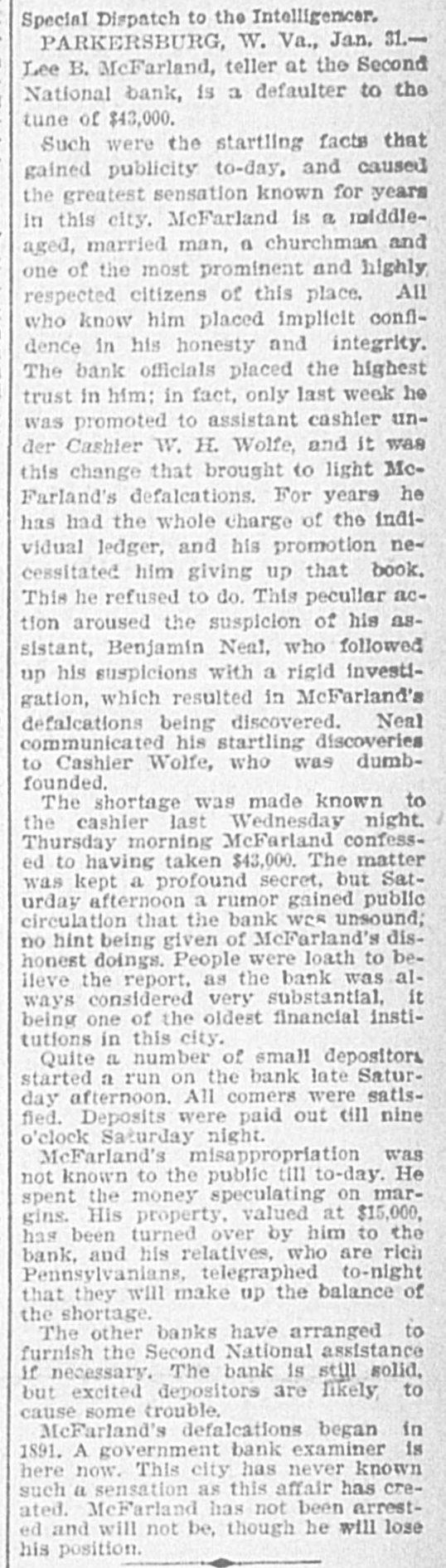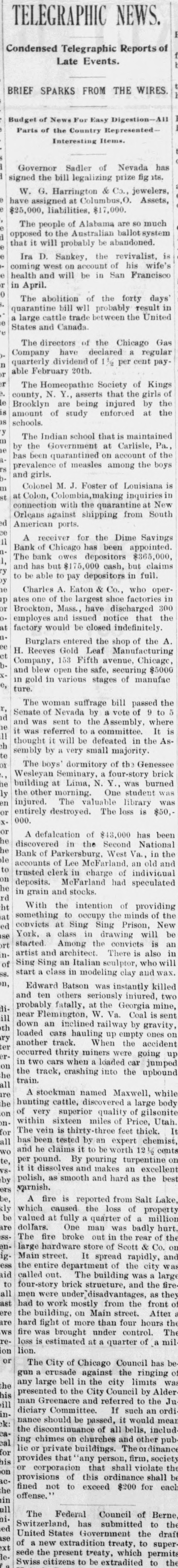 TELEGRAPHIC NEWS. Condensed Telegraphic Reports of Late Events. BRIEF SPARKS FROM THE WIRES. Budget of News For Easy Digestion-All Parts of the Country RepresentedInteresting Items. Governor Sadler of Nevada has signed the bill legalizing prize fig its. W. G. Harrington & Co., jewelers, have assigned at Columbus, Assets, $25,000, liabilities, $17,000. The people of Alabama are so much opposed to the Australian ballot system that it will probably be abandoned. e Ira D. Sankey, the revivalist, is coming west on account of his wife's health and will be in San Francisco in April. The abolition of the forty days' quarantine bill wll probably result in a large cattle trade between the United 0 States and Canada. The directors of the Chicago Gas Company have declared a regular n quarterly dividend of 1½ per cent payable February 20th. r r The Homeopathic Society of Kings county, N. Y., asserts that the girls of e Brooklyn are being injured by the IS amount of study enforced at the is schools. y The Indian school that is maintained E 10 by the Government at Carlisle, Pa., has been quarantined on account of the 15 prevalence of measles among the boys and girls. m Colonel M. J. Foster of Louisiana is st at Colon, Colombia, making inquiries in connection with the quarantine at New Orleans against shipping from South d American ports. ce 11 A receiver for the Dime Savings Bank of Chicago has been appointed. The bank owes depositors $365,000, 1, and has but $175,000 cash, but claims y to be able to pay depositors in full. y 10 Charles A. Eaton & Co., who operp ates one of the largest shoe factories in or Brockton. Mass., have discharged 300 employes and issued notice that the at factory would be closed indefinitely. 1. Burglars entered the shop of the A. ee et H. Reeves Gold Leaf Manufacturing Company, 153 Fifth avenue, Chicage, and blew open the safe, securing $5000 in gold in various stages of manufac ture. The woman suffrage bill passed the Senate of Nevada by a vote of 9 to 5 id and was sent to the Assembly, where 10 it was referred to a committee. It is 11 thought it will be defeated in the Ash te sembly by a very small majority. 01 The boys' dormitory of the Genessee Wesleyan Seminary, a four-story brick 18 building at Lima, N. Y., was burned ly the other morning. One student was en injured. The valuable library was or 000. entirely destroyed. The loss is $50,is or A defalcation of $43,000 has been ne discovered in the Second National ne Bank of Parkersburg. West Va., in the de accounts of Lee McFarland. an old and to trusted clerk in charge of indivioual on deposits. McFarland had speculated ne in grain and stocks. rd ht With the intention of providing at something to occupy the minds of the ed convicts at Sing Sing Prison, New se York, a class in drawing will be rt started. Among the convicts is an n. artist and architect. There is also in of Sing Sing an Italian sculptor, who will SS. start a class in modeling clay and wax. n, Edward Batson was instantly killed and ten others seriously injured, two iiprobably fatally, at the Georgia mine, ill near Flemington, W. Va. Coal is sent th down an inclined railway by gravity ry loaded cars hauling up empty ones or er another track. When the accident roccurred thrity miners were going up on in two cars when a loaded car jumped the train. the track, crashing into the upbound all A stockman named Maxiuall