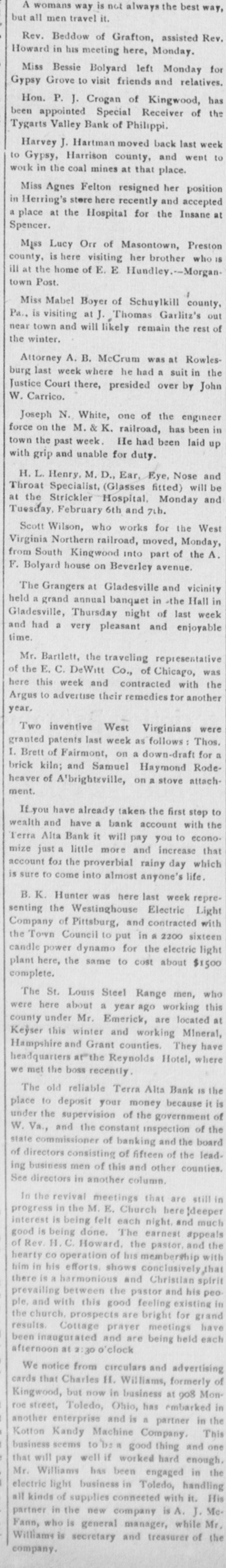 but all men travel it. Rev. Beddow of Grafton, assisted Rev. Howard in his meeting here, Monday. Miss Bessie Bolyard left Monday for Gypsy Grove to visit friends and relatives. Hon. P. J. Crogan of Kingwood, has been appointed Special Receiver of the Tygarts Valley Bank of Philippi. Harvey J. Hartman moved back last week to Gypsy, Harrison county, and went to work in the coal mines at that place. Miss Agnes Felton resigned her position in Herring's store here recently and accepted a place at the Hospital for the Insane at Spencer. Miss Lucy Orr of Masontown, Preston county, is here visiting her brother who is ill at the home of E. E Hundley.--Morgantown Post. Miss Mabel Boyer of Schuylkill / county, Pa., is visiting at J. Thomas Garlitz's out near town and will likely remain the rest of the winter. Attorney A. B. McCrum was at Rowlesburg last week where he had a suit in the Justice Court there, presided over by John W. Carrico. Joseph N. White, one of the engineer force on the M. & K. railroad, has been in town the past week. He had been laid up with grip and unable for duty. H. L. Henry, M. D., Ear, Eye, Nose and Throat Specialist, (Glasses fitted) will be at the Strickler Hospital, Monday and Tuesday, February 6th and 7th. Scott Wilson, who works for the West Virginia Northern railroad, moved, Monday, from South Kingwood into part of the A. F. Bolyard house on Beverley avenue. The Grangers at Gladesville and vicinity held a grand annual banquet in -the Hall in Gladesville, Thursday night of last week and had a very pleasant and enjoyable time. Mr. Bartlett, the traveling representative of the E. C. DeWitt Co., of Chicago, was here this week and contracted with the Argus to advertise their remedies for another year. Two inventive West Virginians were granted patents last week as follows Thos. I. Brett of Fairmont, on a down-draft for a brick kiln; and Samuel Haymond Rodeheaver of A'brightsville, on a stove attachment. If.you have already taken the first step to wealth and have a bank account with the Terra Alta Bank it will pay you to econo. mize just a little more and increase that account for the proverbial rainy day which is sure to come into almost anyone's life. B. K. Hunter was here last week representing the Westinghouse Electric Light Company of Pittsburg, and contracted with the Town Council to put in a 2200 sixteen candle power dynamo for the electric light plant here, the same to cost about $1500 complete. The St. Louis Steel Range men, who were here about a year ago working this county under Mr. Emerick, are located at Keyser this winter and working Mineral, Hampshire and Grant counties. They have headquarters at the Reynolds Hotel, where we met the boss recently. The old reliable Terra Alta Bank IS the place to deposit your money because it is under the supervision of the government of W. Va., and the constant inspection of the state commissioner of banking and the board of directors consisting of fifteen of the leading business men of this and other counties. See directors in another column. In the revival meetings that are still in progress in the M. E. Church here |deeper interest is being felt each night, and much good is being done. The earnest appeals of Rev. H. C. Howard, the pastor, and the hearty CO operation of his membership with him in his efforts, shows conclusively that there is a harmonious and Christian spirit prevailing between the pastor and his peo ple, and with this good feeling existing in the church, prospects are bright for grand results. Cottage prayer meetings have been inaugurated and are being held each afternoon at o'clock We notice from circulars and advertising cards that Charles H. Williams, formerly of Kingwood, but now in business at 908 Monroe street, Toledo, Ohio, has embarked in another enterprise and is a partner in the Kotton Kandy Machine Company. This business seems to ben a good thing and one that will pay well if worked hard enough, Mr. Williams has been engaged in the electric light business in Toledo, handling all kinds of supplies connected with it. His partner in the new company is A. J. McFann, who is general manager, while Mr. Williams is secretary and treasurer of the