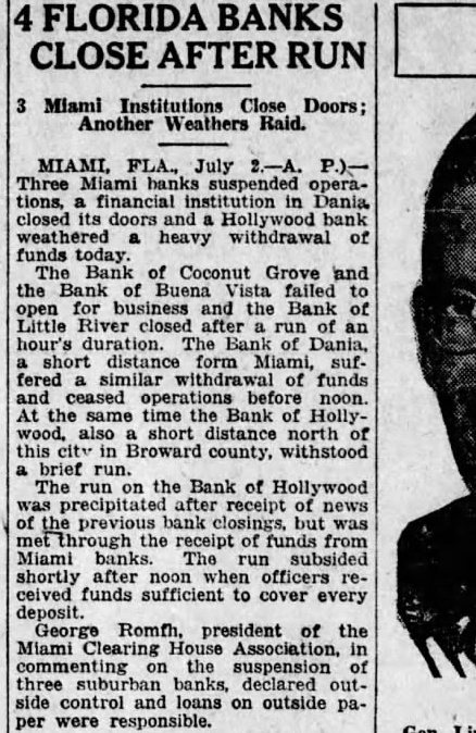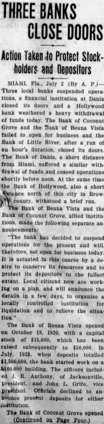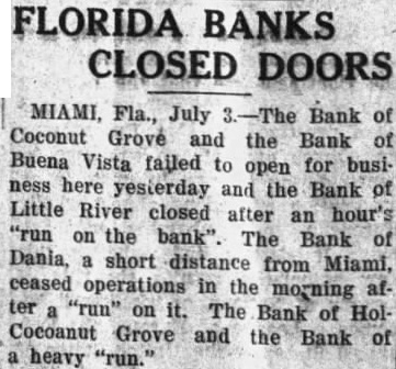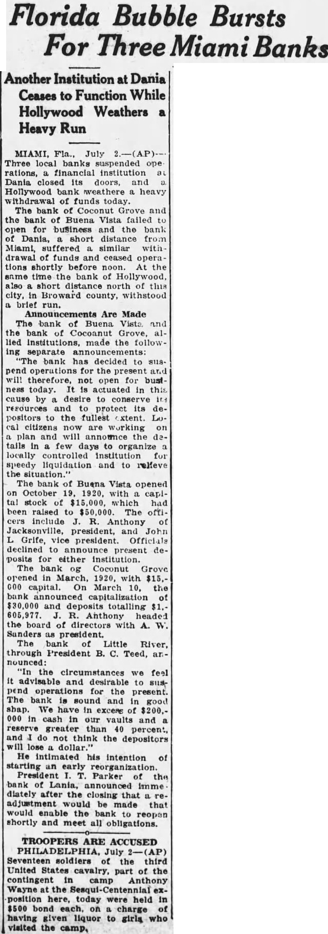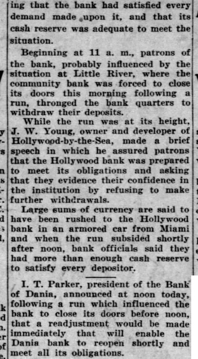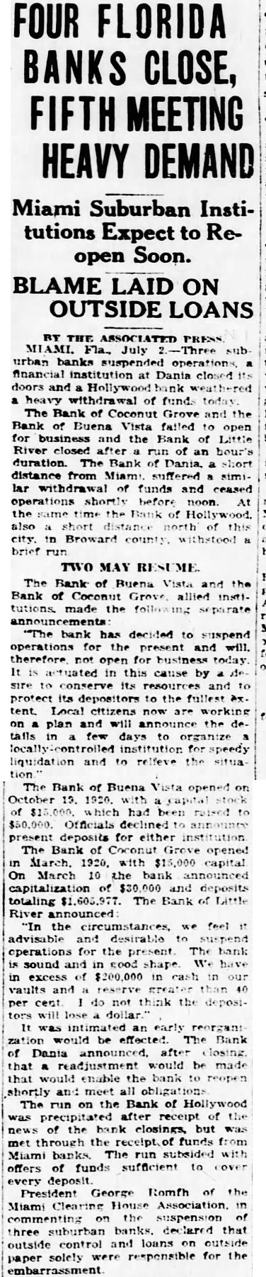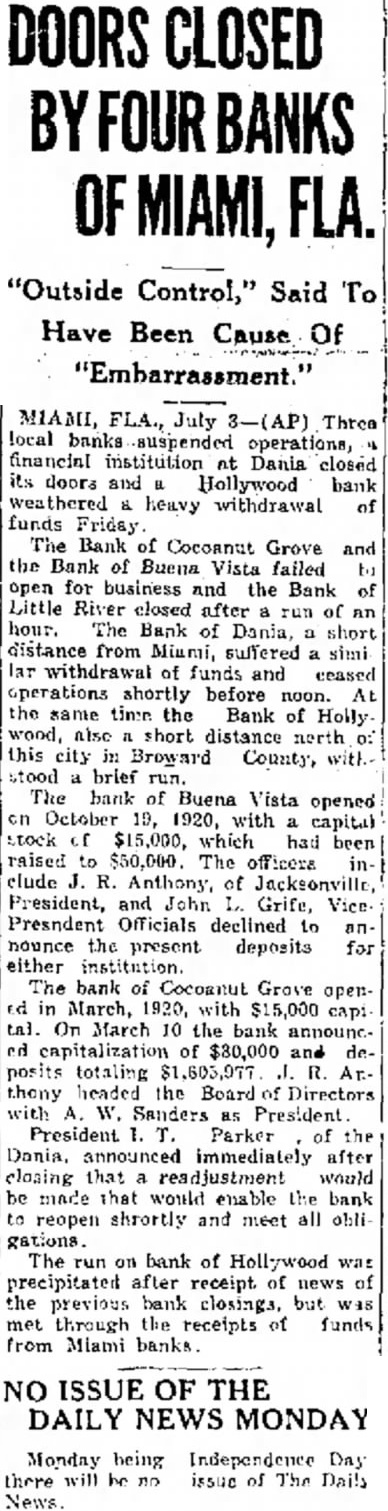 Rain Cools Princeton. ment would be made that would Princeton, Ky., July (Spe- enable the bank to re-open shortcial.) After sweltering under an and meet all obligations. excessive torrid wave for three Hollywood Bank Recovers days in which the temperature The run on the bank of Hollyrecorded by the official government wood was precipitated after receipts thermometer reached the high mark of news of the previous bank closof 99 degrees this afternoon. Temings, but was met through the porary relief was afforded early toceipt of funds from Miami banks. night by copious rain. The run subsided shortly after The total rainfall was one and noon when officers found funds inches, which only lacked quarter sufficient to cover every deposit. one-twentieth of an inch of equaling President George Romfh of the the total rainfall for the whole Miami Clearing House association last month. upon the suspension The rain was of untold benefit to three suburban banks, declared gardens and vegetagrowing crops, that outside control and loans tion. brisk wind preceded the outside paper solely were responrain, damaging shade trees considsible for the erably by twisting and breaking the "The banks of Miami today limbs causing considerable concircuit in the elec- impregnable position" Clark fusion. short the Davis, president of the City Nationtrical current plunged minutes, Bank and Trust company, tota] darkness occa- "Each of the downtown banks and added sioned by the rain and wind. today operating entirely