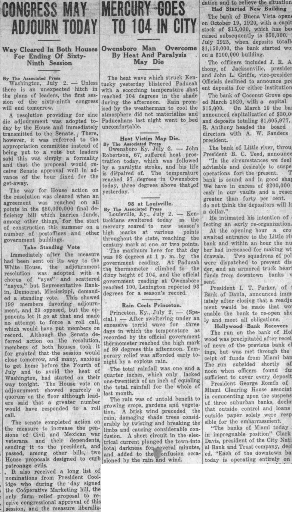Heat Victim May Die. The Ky. John Robertson, 67, suffered heat prostration today, which was followed paralytic stroke, and his life dispaired of. The temperature reached degrees in Owensboro today, three degrees above yesterday. at Louisville. do think the depositors will lose The Press Louisville, July KenHe intimated his intention of eftuckians sweltered today as the fecting an early mercury soared to new season's At the opening hour crowd high marks at various points awaited to the Little river throughout the state, reaching the bank and within an hour the century mark at one or two points. The maximum here for that day ber had increased for making with98 by the drawals. Two squadrons of degrees government reading. At Paducah dispatched to prevent disorthe thermometer climbed to the der, and an armored truck bearing height of 104, and the official funds from downtown banks was dizzy government reading sent. reached Lexington reported President Parker, of the degrees for season's record. Bank of Dania, announced immed-