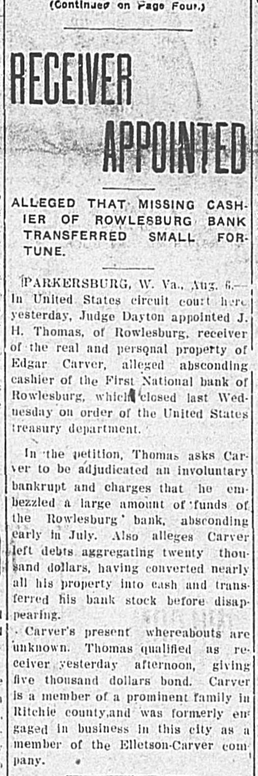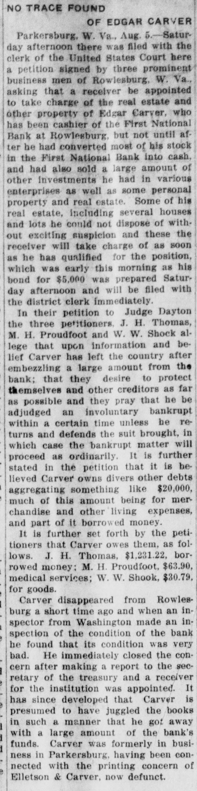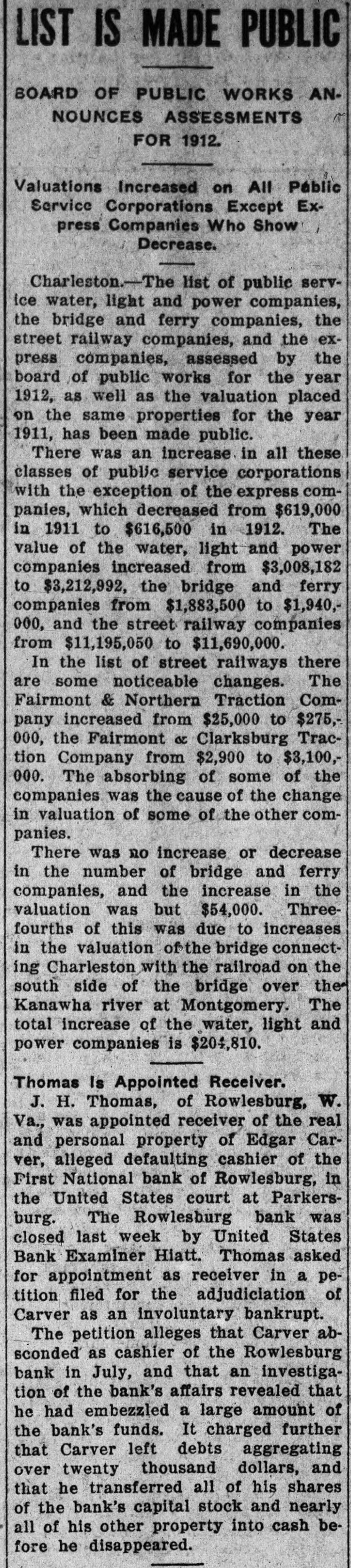 LIST IS MADE PUBLIC BOARD OF PUBLIC WORKS ANNOUNCES ASSESSMENTS FOR 1912. Valuations Increased on All Páblic Service Corporations Except Express Companies Who Show Decrease. Charleston.-The list of public service water, light and power companies, the bridge and ferry companies, the street railway companies, and the express companies, assessed by the board of public works for the year 1912, as well as the valuation placed on the same properties for the year 1911, has been made public. There was an increase in all these classes of public service corporations with the exception of the express companies, which decreased from $619,000 in 1911 to $616,500 in 1912. The value of the water, light and power companies increased from $3,008,182 to $3,212,992, the bridge and ferry companies from $1,883,500 to $1,940,000, and the street railway companies from $11,195,050 to $11,690,000. In the list of street railways there are some noticeable changes. The Fairmont & Northern Traction Company increased from $25,000 to $275,000, the Fairmont & Clarksburg Traction Company from $2,900 to $3,100,000. The absorbing of some of the companies was the cause of the change in valuation of some of the other companies. There was no increase or decrease in the number of bridge and ferry companies, and the increase in the valuation was but $54,000. Threefourths of this was due to increases in the valuation of the bridge connecting Charleston with the railroad on the south side of the bridge over the Kanawha river at Montgomery. The total increase of the water, light and power companies is $204,810. Thomas Is Appointed Receiver. J. H. Thomas, of Rowlesburg, W. Va., was appointed receiver of the real and personal property of Edgar Carver, alleged defaulting cashier of the First National bank of Rowlesburg, in the United States court at Parkersburg. The Rowlesburg bank was closed last week by United States Bank Examiner Hiatt. Thomas asked for appointment as receiver in a petition filed for the adjudiciation of Carver as an involuntary bankrupt. The petition alleges that Carver absconded as cashier of the Rowlesburg bank in July, and that an investigation of the bank's affairs revealed that he had embezzled a large amount of the bank's funds. It charged further that Carver left debts aggregating over twenty thousand dollars, and that he transferred all of his shares of the bank's capital stock and nearly all of his other property into cash before he disappeared.