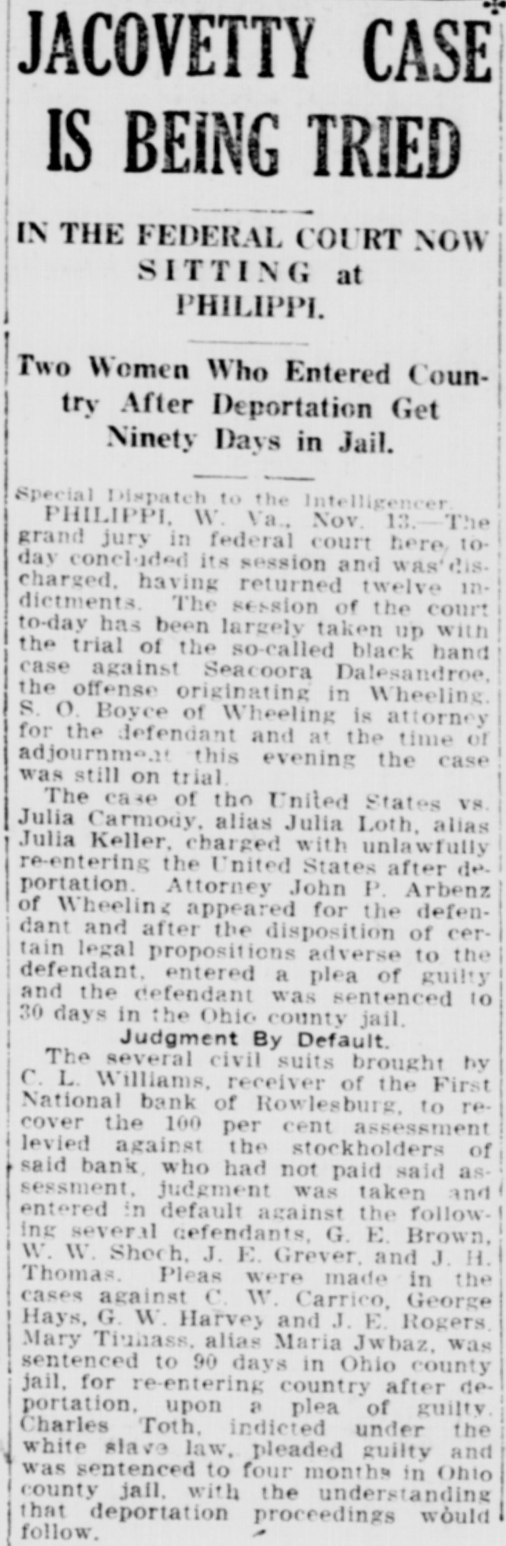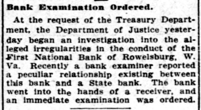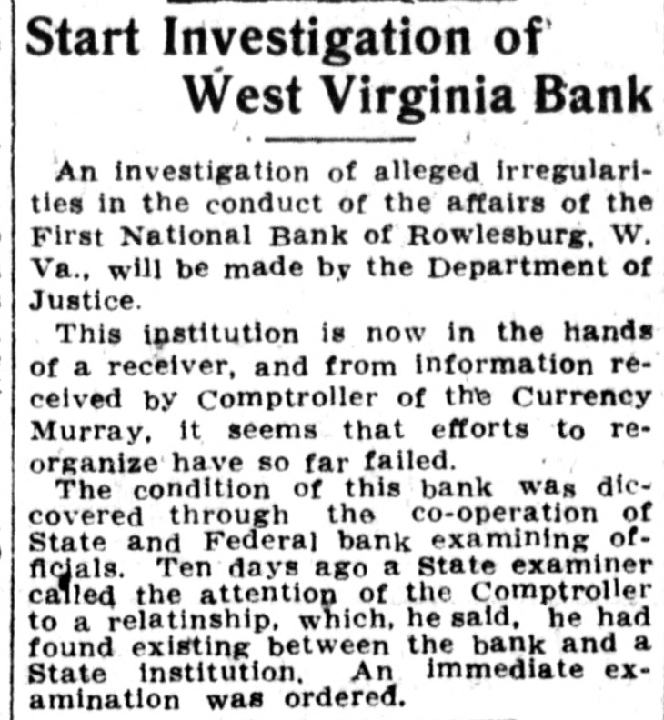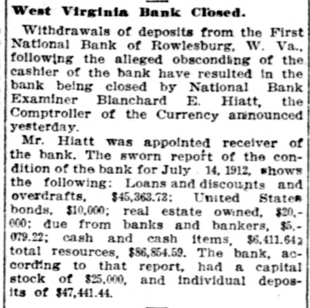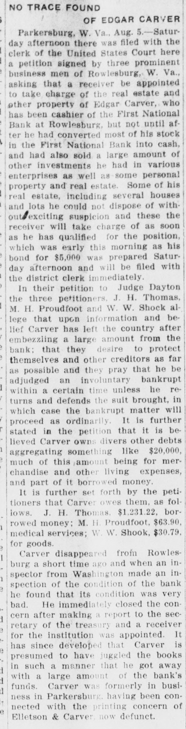 LIST IS MADE PUBLIC BOARD OF PUBLIC WORKS ANNOUNCES ASSESSMENTS FOR 1912. Valuations Increased on All Páblic Service Corporations Except Express Companies Who Show Decrease. Charleston.-The list of public service water, light and power companies, the bridge and ferry companies, the street railway companies, and the express companies, assessed by the board of public works for the year 1912, as well as the valuation placed on the same properties for the year 1911, has been made public. There was an increase in all these classes of public service corporations with the exception of the express companies, which decreased from $619,000 in 1911 to $616,500 in 1912. The value of the water, light and power companies increased from $3,008,182 to $3,212,992, the bridge and ferry companies from $1,883,500 to $1,940,000, and the street railway companies from $11,195,050 to $11,690,000. In the list of street railways there are some noticeable changes. The Fairmont & Northern Traction Company increased from $25,000 to $275,000, the Fairmont & Clarksburg Traction Company from $2,900 to $3,100,000. The absorbing of some of the companies was the cause of the change in valuation of some of the other companies. There was no increase or decrease in the number of bridge and ferry companies, and the increase in the valuation was but $54,000. Threefourths of this was due to increases in the valuation of the bridge connecting Charleston with the railroad on the south side of the bridge over the Kanawha river at Montgomery. The total increase of the water, light and power companies is $204,810. Thomas Is Appointed Receiver. J. H. Thomas, of Rowlesburg, W. Va., was appointed receiver of the real and personal property of Edgar Carver, alleged defaulting cashier of the First National bank of Rowlesburg, in the United States court at Parkersburg. The Rowlesburg bank was closed last week by United States Bank Examiner Hiatt. Thomas asked for appointment as receiver in a petition filed for the adjudiciation of Carver as an involuntary bankrupt. The petition alleges that Carver absconded as cashier of the Rowlesburg bank in July, and that an investigation of the bank's affairs revealed that he had embezzled a large amount of the bank's funds. It charged further that Carver left debts aggregating over twenty thousand dollars, and that he transferred all of his shares of the bank's capital stock and nearly all of his other property into cash before he disappeared.