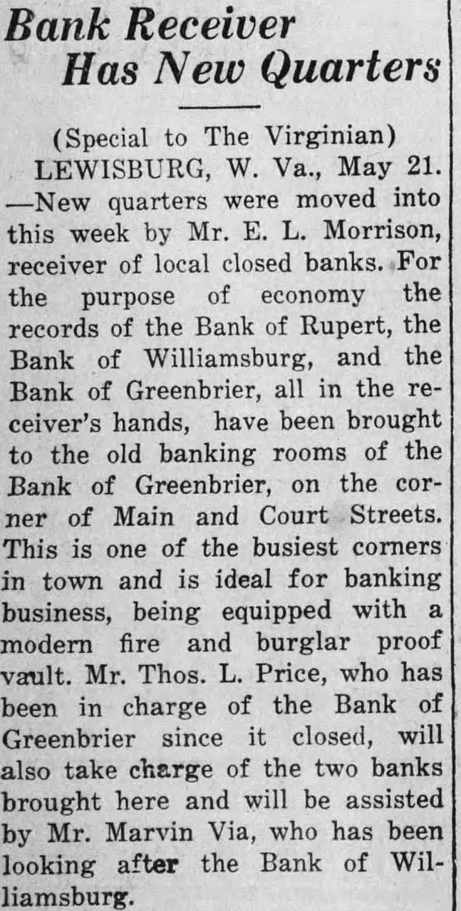 Bank Receiver Has New Quarters (Special to The Virginian) LEWISBURG, W. Va., May 21. moved into quarters this week by Mr. Morrison, receiver of local closed of the the purpose economy records of the Bank of Rupert, the of Williamsburg, and the Bank Bank of Greenbrier, all in the ceiver's hands, have been brought to the old banking rooms of the Bank of Greenbrier, on the of Main and This is one of the busiest corners in and is ideal for banking town business, being equipped with modern fire and burglar proof vault. Mr. Thos. Price, who has been in charge of the Bank of Greenbrier since closed, will also take charge the two banks brought here and will be assisted Mr. Marvin Via, who been by looking after the Bank of Williamsburg.