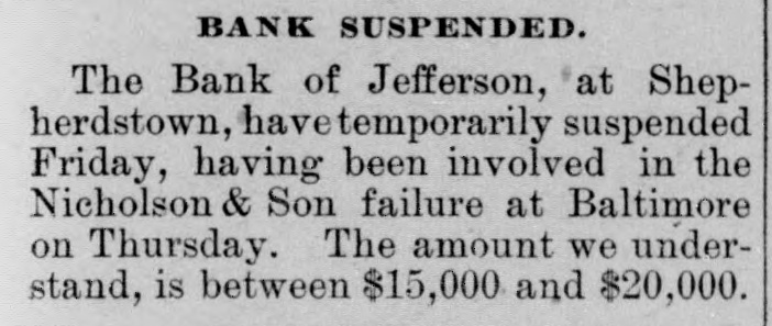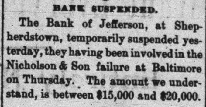 BANK SUSPENDED. The Bank of Jefferson, at Shepherdstown, temporarily suspended yesterday, they having been involved in the Nicholson & Son failure at Baltimore on Thursday. The amount we understand, is between $15,000 and $20,000.