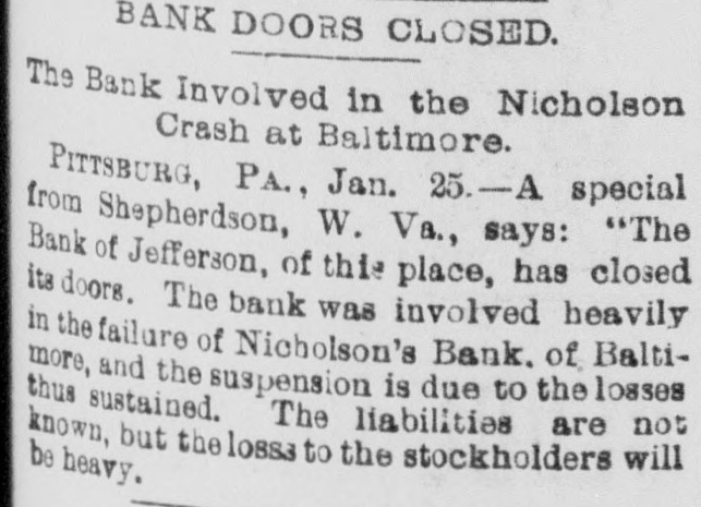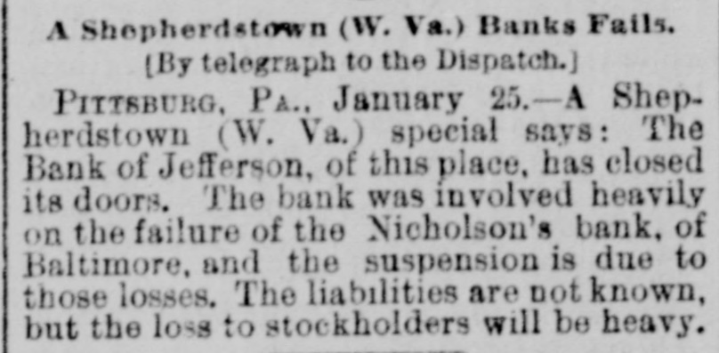 A Shepherdstown (W. Va.) Banks Fails. (By telegraph to the Dispatch.] PITTSBURG, PA., January 25.-A Shepherdstown (W. Va.) special says: The Bank of Jefferson, of this place, has closed its doors. The bank was involved heavily on the failure of the Nicholson's bank, of Baltimore, and the suspension is due to those losses. The liabilities are not known, but the loss to stockholders will be heavy.