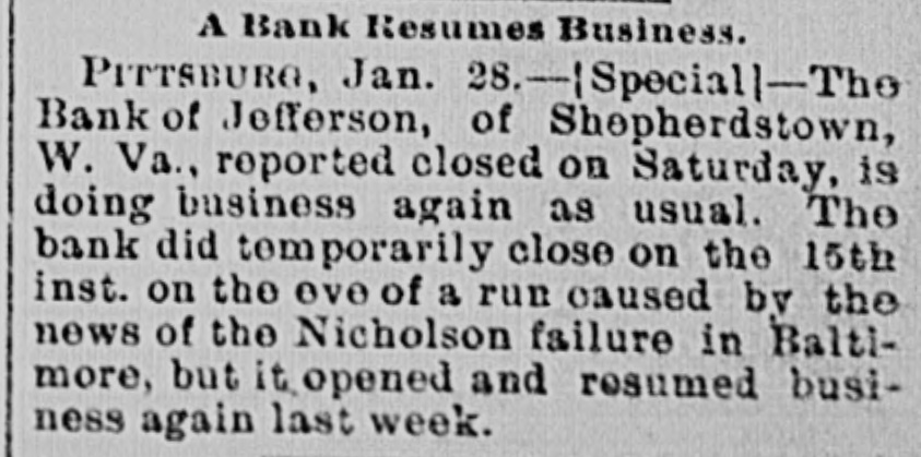 A Bank Resumes Business. PITTSBURG, Jan. 28.--|Special|-The Bank of Jefferson, of Shepherdstown, W. Va., reported closed on Saturday, is doing business again as usual. The bank did temporarily close on the 15th inst. on the eve of a run caused by the news of the Nicholson failure in Baltimore, but it opened and resumed business again last week.