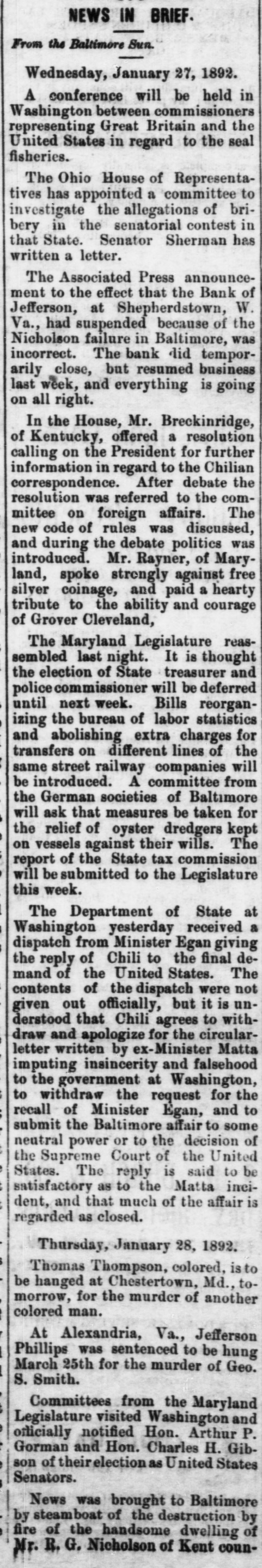 NEWS BRIEF. From the Baltimore Sun. Wednesday, January 27, 1892. A conference will be held in Washington between commissioners representing Great Britain and the United States in regard to the seal fisheries. The Ohio House of Representatives has appointed a committee to investigate the allegations of bribery in the senatorial contest in that State. Senator Sherman has written a letter. The Associated Press announcement to the effect that the Bank of Jefferson, at Shepherdstown, W. Va., had suspended because of the Nicholson failure in Baltimore, was incorrect. The bank did temporarily close, but resumed business last week, and everything is going on all right. In the House, Mr. Breckinridge, of Kentucky, offered a resolution calling on the President for further information in regard to the Chilian correspondence. After debate the resolution was referred to the committee on foreign affairs. The new code of rules was discussed, and during the debate politics was introduced. Mr. Rayner, of Maryland, spoke strengly against free silver coinage, and paid a hearty tribute to the ability and courage of Grover Cleveland, The Maryland Legislature reassembled last night. It is thought the election of State treasurer and police commissioner will be deferred until next week. Bills reorganizing the bureau of labor statistics and abolishing extra charges for transfers on different lines of the same street railway companies will be introduced. A committee from the German societies of Baltimore will ask that measures be taken for the relief of oyster dredgers kept on vessels against their wills. The report of the State tax commission will be submitted to the Legislature this week. The Department of State at Washington yesterday received a dispatch from Minister Egan giving the reply of Chili to the final demand of the United States. The contents of the dispatch were not given out officially, but it is understood that Chili agrees to withdraw and apologize for the circularletter written by ex-Minister Matta imputing insincerity and falsehood to the government at Washington, to withdraw the request for the recall of Minister Egan, and to submit the Baltimore affair to some neutral power or to the decision of the Supreme Court of the United States. The reply is said to be satisfactory as to the Matta incident, and that much of the affair is regarded as closed. Thursday, January 28, 1892. Thomas Thompson, colored, is to be hanged at Chestertown, Md., tomorrow, for the murder of another colored man. At Alexandria, Va., Jefferson Phillips was sentenced to be hung March 25th for the murder of Geo. S. Smith. Committees from the Maryland Legislature visited Washington and officially notified Hon. Arthur P. Gorman and Hon. Charles H. Gibson of theirelection as United States Senators. News was brought to Baltimore by steamboat of the destruction by fire of the handsome dwelling of NE!