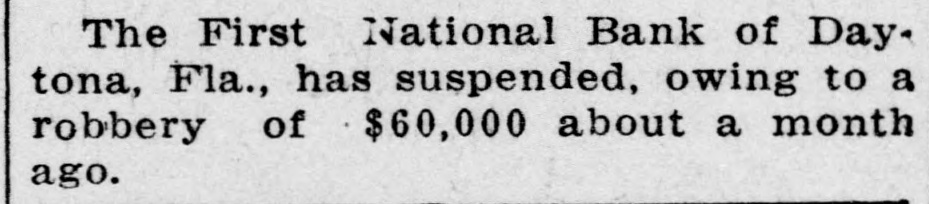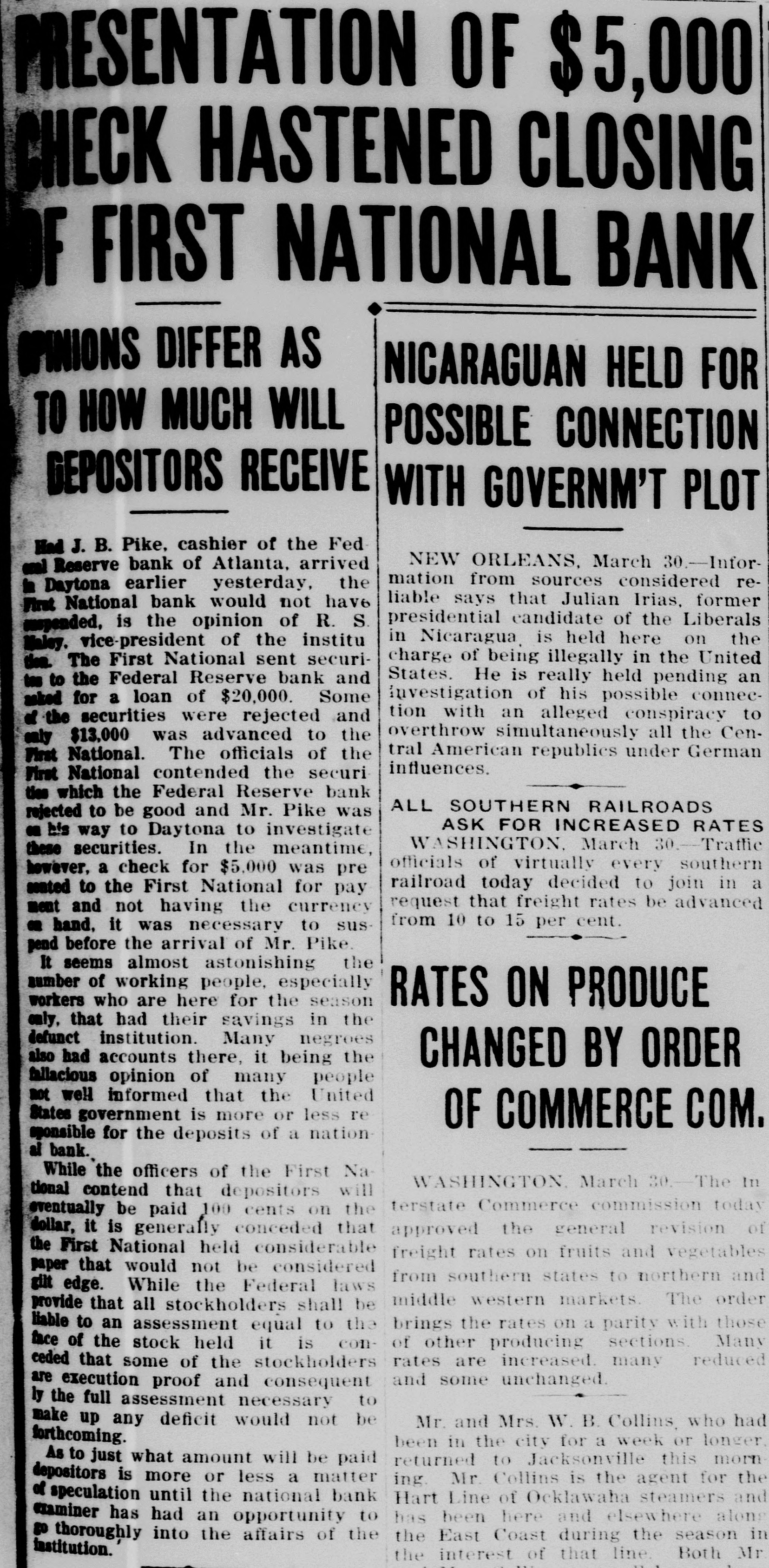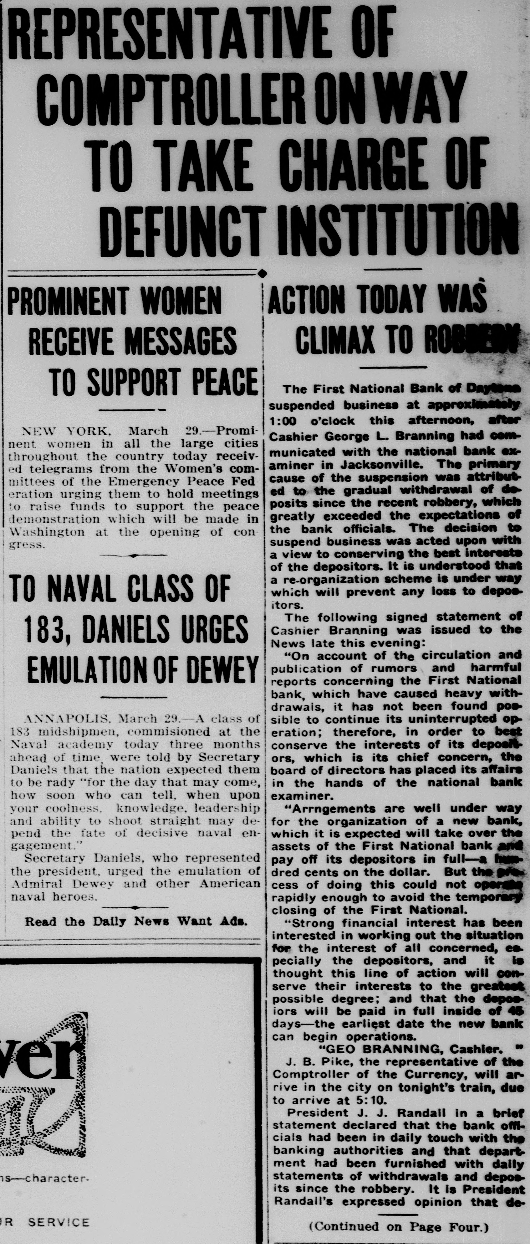 REPRESENTATIVE OF COMPTROLLER ON WAY TO TAKE CHARGE OF DEFUNCT INSTITUTION ACTION TODAY WAS PROMINENT WOMEN CLIMAX TO ROBDENN RECEIVE MESSAGES The First National Bank of Daytena TO SUPPORT PEACE suspended business at approximately 1:00 o'clock this afternoon, after NEW YORK. March 29. PromiCashier George L. Branning had comnent women in all the large cities municated with the national bank exthroughout the country today receivaminer in Jacksonville. The primary ed telegrams from the Women's comcause of the suspension was attributmittees of the Emergency Peace Fed ed to the gradual withdrawal of do eration urging them to hold meetings posits since the recent robbery, which to raise funds to support the peace greatly exceeded the expectations of demonstration which will be made in the bank officials. The decision to Washington at the opening of consuspend business was acted upon with gress. a view to conserving the best interests of the depositors. It is understood that a re-organization scheme is under way which will prevent any loss to deposTO NAVAL CLASS OF itors. The following signed statement of Cashier Branning was issued to the 183, DANIELS URGES News late this evening: "On account of the circulation and publication of rumors and harmful EMULATION OF DEWEY reports concerning the First National bank, which have caused heavy withdrawais, it has not been found posANNAPOLIS. March 29.- class of sible to continue its uninterrupted op183 midshipmen, commisioned at the eration; therefore, in order to best conserve the interests of its deposit Naval academy today three months ahead of time were told by Secretary ors, which is its chief concern, the Daniels that the nation expected them board of directors has placed its affairs in the hands of the national bank to be rady "for the day that may come, examiner. how soon who can tell, when upon your coolness, knowledge, leadership "Arrngements are well under way and ability to shoot straight may defor the organization of a new bank, which it is expected will take over the pend the fate of decisive naval engagement." assets of the First National bank and humSecretary Daniels, who represented pay off its depositors in full dred cents on the dollar. But the the president, urged the emulation of Admiral Dewey and other American cess of doing this could not naval heroes. rapidly enough to avoid the temporary closing of the First National. Read the Daily News Want Ads. "Strong financial interest has been interested in working out the situation for the interest of all concerned, ea pecially the depositors, and it is thought this line of action will conserve their interests to the greatest possible degree; and that the deposiors will be paid in full inside of 45 days-the earliest date the new bank can begin operations. "GEO BRANNING, Cashier. J. B. Pike, the representative of the er Comptroller of the Currency, will arrive in the city on tonight's train, due to arrive at 5:10. President J. J. Randall in a brief statement declared that the bank officials had been in daily touch with the banking authorities and that depart ment had been furnished with daily is-characterstatements of withdrawals and deposits since the robbery. It is President Randall's expressed opinion that deR SERVICE (Continued on Page Four.)