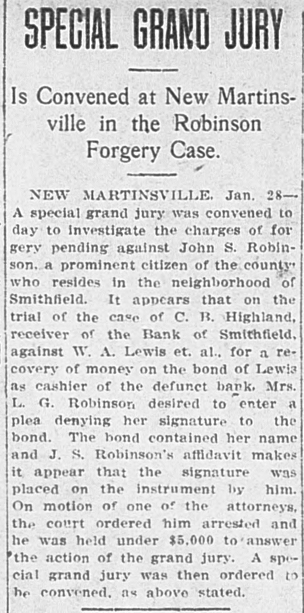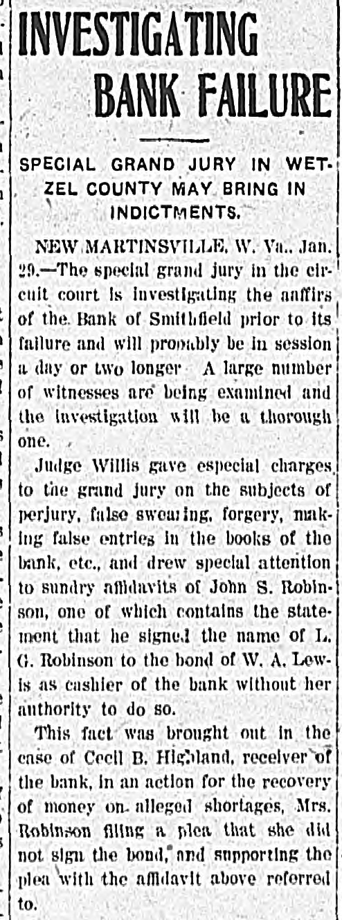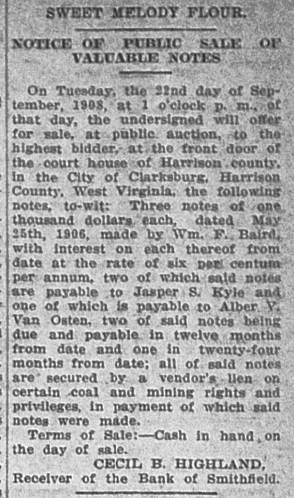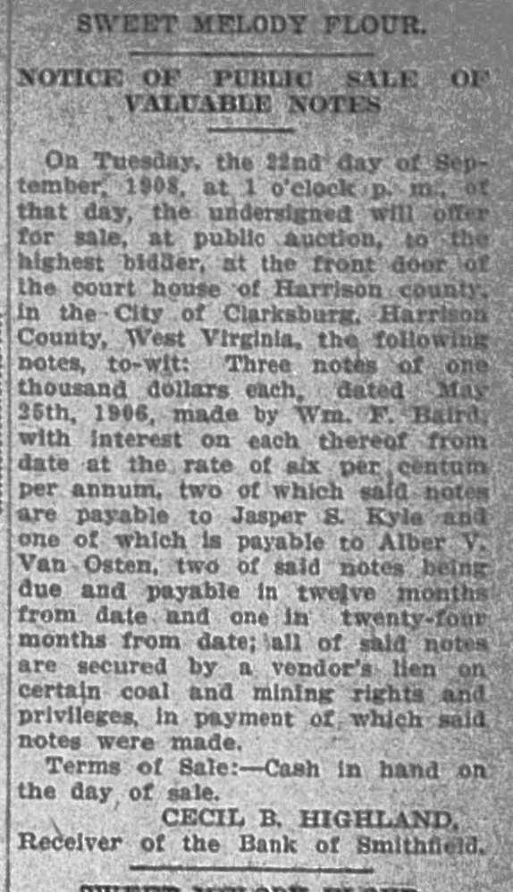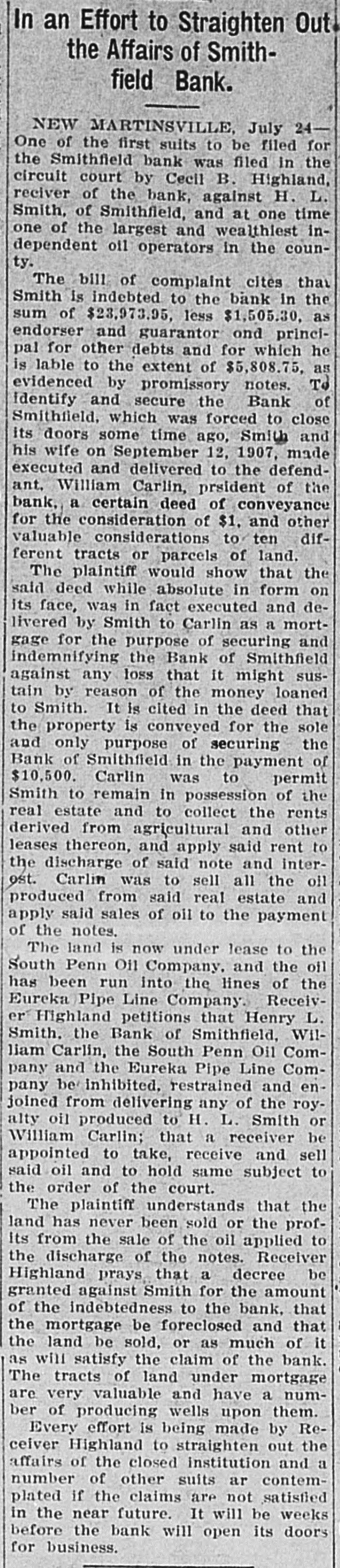 In an Effort to Straighten Out the Affairs of Smithfield Bank. NEW MARTINSVILLE, July 24One of the first suits to be filed for the Smithfield bank was filed in the circuit court by Cecil B. Highland, reciver of the bank, against H. L. Smith, of Smithfield, and at one time one of the largest and wealthlest independent oil operators in the county. The bill of complaint cites that Smith is indebted to the bank in the sum of $23,973.95, less $1,505.30, as endorser and guarantor ond principal for other debts and for which he is lable to the extent of $5,808.75, as evidenced by promissory notes. To identify and secure the Bank of Smithfield, which was forced to close its doors some time ago, Smith and his wife on September 12, 1907, made executed and delivered to the defendant, William Carlin, prsident of the bank, a certain deed of conveyance for the consideration of $1, and other valuable considerations to ten different tracts or parcels of land. The plaintiff would show that the said deed while absolute in form on its face, was in fact executed and delivered by Smith to Carlin as a mortgage for the purpose of securing and indemnifying the Bank of Smithfield against any loss that it might sustain by reason of the money loaned to Smith. It is cited in the deed that the property is conveyed for the sole and only purpose of securing the Bank of Smithfield in the payment of $10,500. Carlin was to permit Smith to remain in possession of the real estate and to collect the rents derived from agricultural and other leases thereon, and apply said rent to the discharge of said note and interest. Carlin was to sell all the oil produced from said real estate and apply said sales of oil to the payment of the notes. The land is now under lease to the South Penn Oil Company. and the oil has been run into the lines of the Eureka Pipe Line Company. Receiver Highland petitions that Henry L. Smith. the Bank of Smithfield, William Carlin, the South Penn Oil Company and the Eureka Pipe Line Company be inhibited, restrained and enjoined from delivering any of the royalty oil produced to H. L. Smith or William Carlin; that a receiver be appointed to take, receive and sell said oil and to hold same subject to the order of the court. The plaintiff understands that the land has never been sold or the profits from the sale of the oil applied to the discharge of the notes. Receiver Highland prays that a decree be granted against Smith for the amount of the indebtedness to the bank, that the mortgage be foreclosed and that the land be sold, or as much of it as will satisfy the claim of the bank. The tracts of land under mortgage are very valuable and have a number of producing wells upon them. Every effort is being made by Receiver Highland to straighten out the affairs of the closed institution and a number of other suits ar contemplated if the claims are not satisfied in the near future. It will be weeks before the bank will open its doors