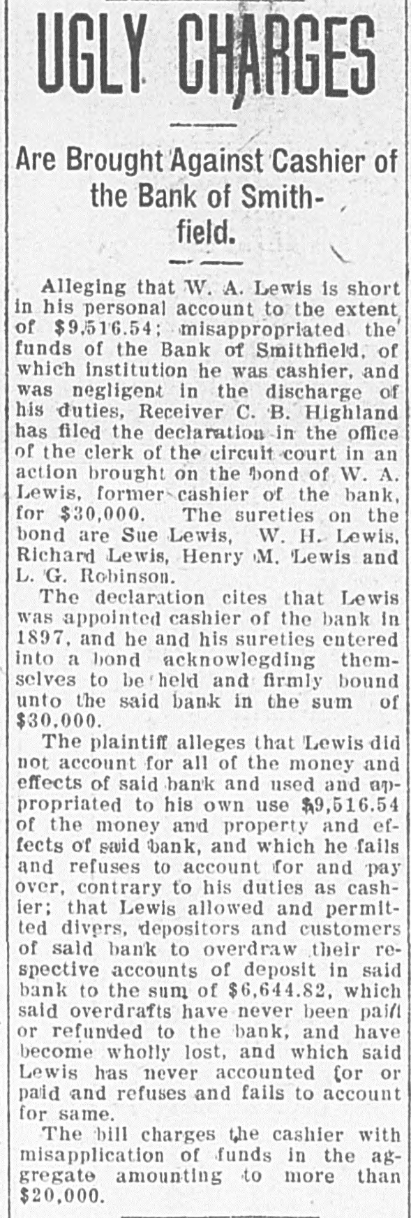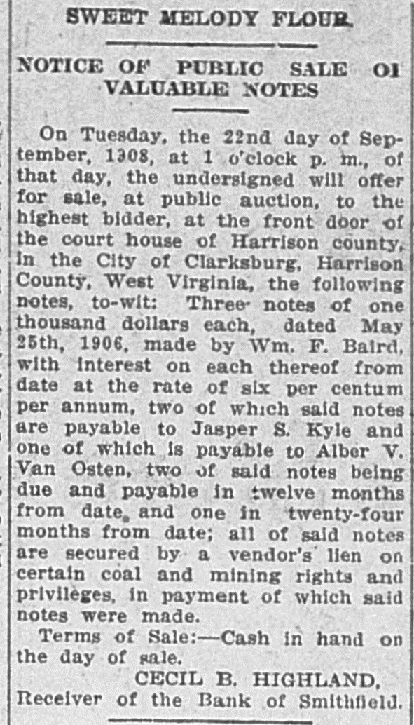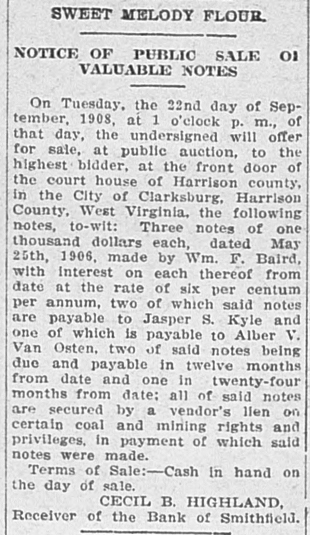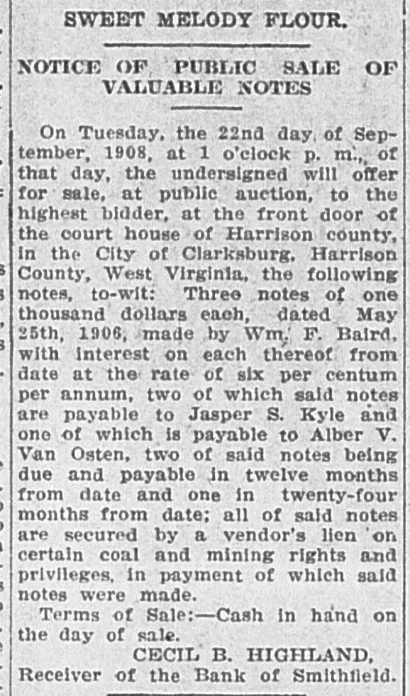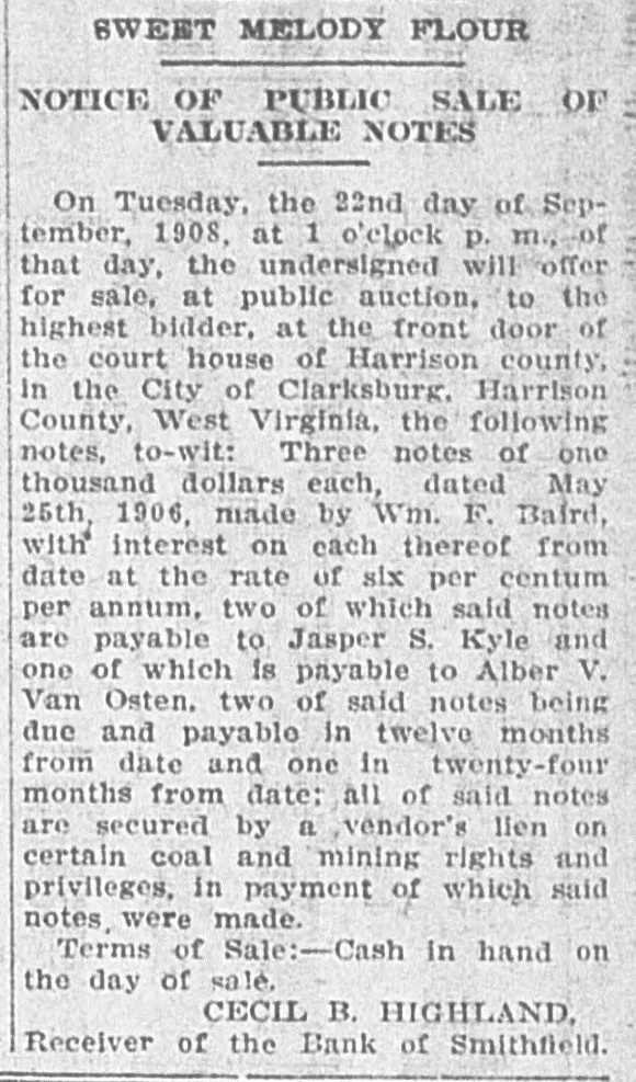 In an Effort to Straighten Out the Affairs of Smithfield Bank. NEW MARTINSVILLE, July 24One of the first suits to be filed for the Smithfield bank was filed in the circuit court by Cecil B. Highland, reciver of the bank, against H. L. Smith, of Smithfield, and at one time one of the largest and wealthlest independent oil operators in the county. The bill of complaint cites that Smith is indebted to the bank in the sum of $23,973.95, less $1,505.30, as endorser and guarantor ond principal for other debts and for which he is lable to the extent of $5,808.75, as evidenced by promissory notes. To identify and secure the Bank of Smithfield, which was forced to close its doors some time ago, Smith and his wife on September 12, 1907, made executed and delivered to the defendant, William Carlin, prsident of the bank, a certain deed of conveyance for the consideration of $1, and other valuable considerations to ten different tracts or parcels of land. The plaintiff would show that the said deed while absolute in form on its face, was in fact executed and delivered by Smith to Carlin as a mortgage for the purpose of securing and indemnifying the Bank of Smithfield against any loss that it might sustain by reason of the money loaned to Smith. It is cited in the deed that the property is conveyed for the sole and only purpose of securing the Bank of Smithfield in the payment of $10,500. Carlin was to permit Smith to remain in possession of the real estate and to collect the rents derived from agricultural and other leases thereon, and apply said rent to the discharge of said note and interest. Carlin was to sell all the oil produced from said real estate and apply said sales of oil to the payment of the notes. The land is now under lease to the South Penn Oil Company. and the oil has been run into the lines of the Eureka Pipe Line Company. Receiver Highland petitions that Henry L. Smith. the Bank of Smithfield, William Carlin, the South Penn Oil Company and the Eureka Pipe Line Company be inhibited, restrained and enjoined from delivering any of the royalty oil produced to H. L. Smith or William Carlin; that a receiver be appointed to take, receive and sell said oil and to hold same subject to the order of the court. The plaintiff understands that the land has never been sold or the profits from the sale of the oil applied to the discharge of the notes. Receiver Highland prays that a decree be granted against Smith for the amount of the indebtedness to the bank, that the mortgage be foreclosed and that the land be sold, or as much of it as will satisfy the claim of the bank. The tracts of land under mortgage are very valuable and have a number of producing wells upon them. Every effort is being made by Receiver Highland to straighten out the affairs of the closed institution and a number of other suits ar contemplated if the claims are not satisfied in the near future. It will be weeks before the bank will open its doors