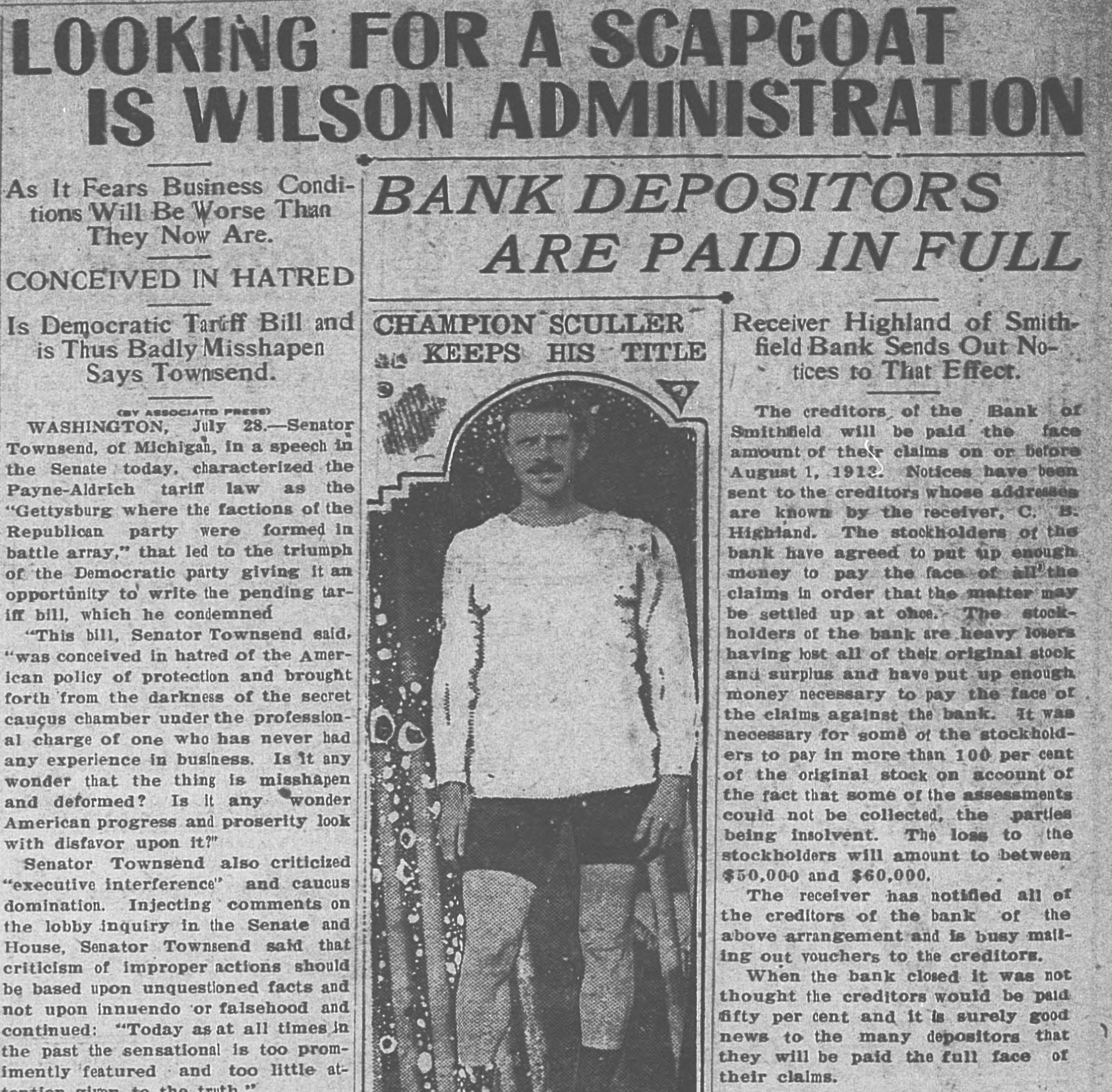 # LOOKING FOR A SCAPGOAT # IS WILSON ADMINISTRATION As It Fears Business Conditions Will Be Worse Than They Now Are. CONCEIVED IN HATRED BANK DEPOSITORS ARE PAID IN FULL Is Democratic Tariff Bill and is Thus Badly Misshapen Says Townsend. CHAMPION SCULLER KEEPS HIS TITLE (BY ASSOCIATED PRESS) WASHINGTON, July 28.-Senator Townsend, of Michigan, in a speech in the Senate today, characterized the Payne-Aldrich tariff law as the "Gettysburg where the factions of the Republican party were formed in battle array," that led to the triumph of the Democratic party giving it an opportunity to write the pending tariff bill, which he condemned. "This bill, Senator Townsend said, "was conceived in hatred of the American policy of protection and brought forth from the darkness of the secret caucus chamber under the professional charge of one who has never had any experience in business. Is it any wonder that the thing is misshapen and deformed? Is it any wonder American progress and proserity look with disfavor upon it?" Senator Townsend also criticized "executive interference" and caucus domination. Injecting comments on the lobby inquiry in the Senate and House, Senator Townsend said that criticism of improper actions should be based upon unquestioned facts and not upon innuendo or falsehood and continued: "Today as at all times in the past the sensational is too prominently featured and too little at- Receiver Highland of Smithfield Bank Sends Out Notices to That Effect. The creditors of the Bank of Smithifield will be paid the face amount of their claims on or before August 1, 1913. Notices have been sent to the creditors whose addresses are known by the receiver, C. B. Highland. The stockholders of the bank have agreed to put up enough money to pay the face of all the claims in order that the matter may be settled up at once. The stockholders of the bank are heavy loser's having lost all of their original stock and surplus and have put up enough money necessary to pay the face of the claims against the bank. It was necessary for some of the stockholders to pay in more than 100 per cent of the original stock on account of the fact that some of the assessments could not be collected, the parties being insolvent. The loss to the stockholders will amount to between $50,000 and $60,000. The receiver has notified all of the creditors of the bank of the above arrangement and is busy mailing out vouchers to the creditors. When the bank closed it was not thought the creditors would be paid fifty per cent and it is surely good news to the many depositors that they will be paid the full face of their claims.