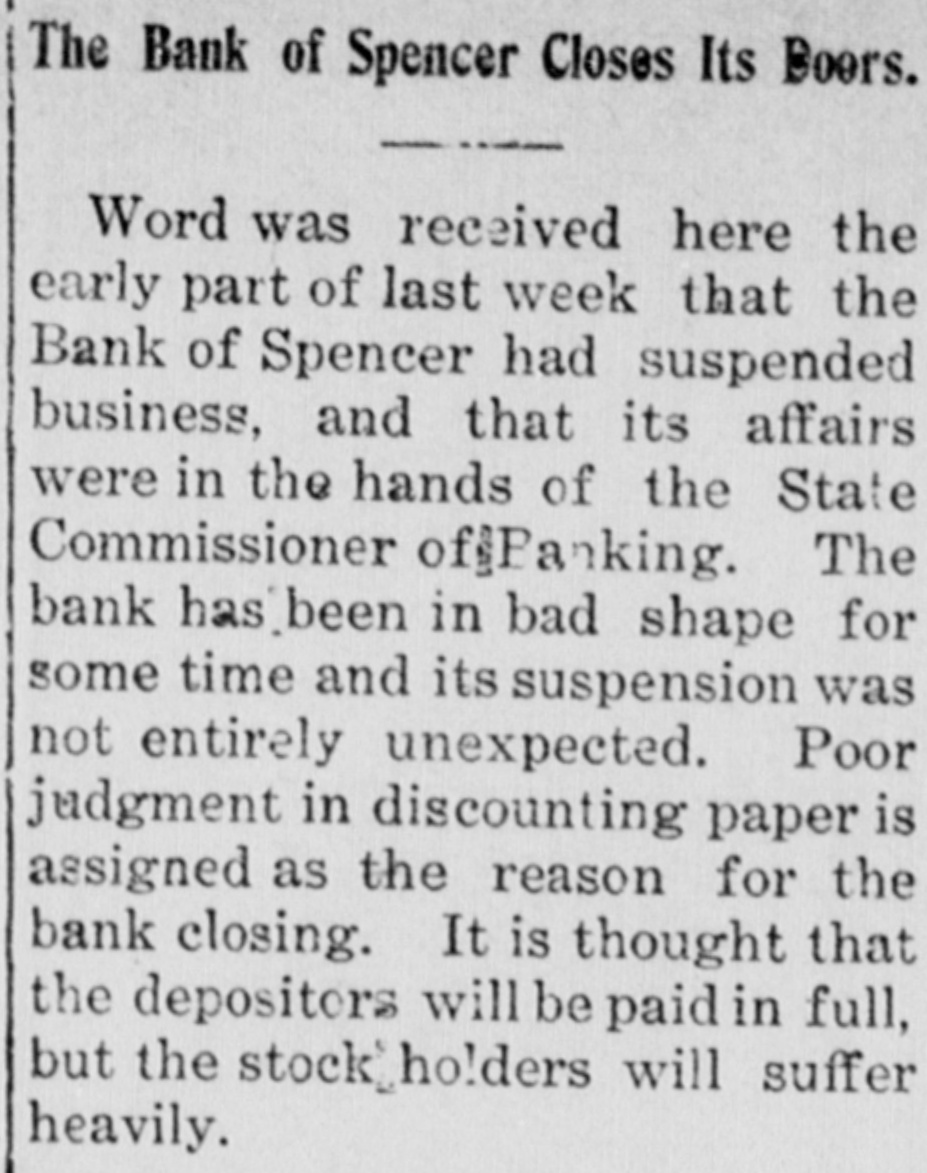 The Bank of Spencer Closes Its Boors. Word was received here the early part of last week that the Bank of Spencer had suspended business, and that its affairs were in the hands of the State Commissioner ofjPanking. The bank has been in bad shape for some time and its suspension was not entirely unexpected. Poor judgment in discounting paper is assigned as the reason for the bank closing. It is thought that the depositors will be paid in full, but the stock]holders will suffer heavily.