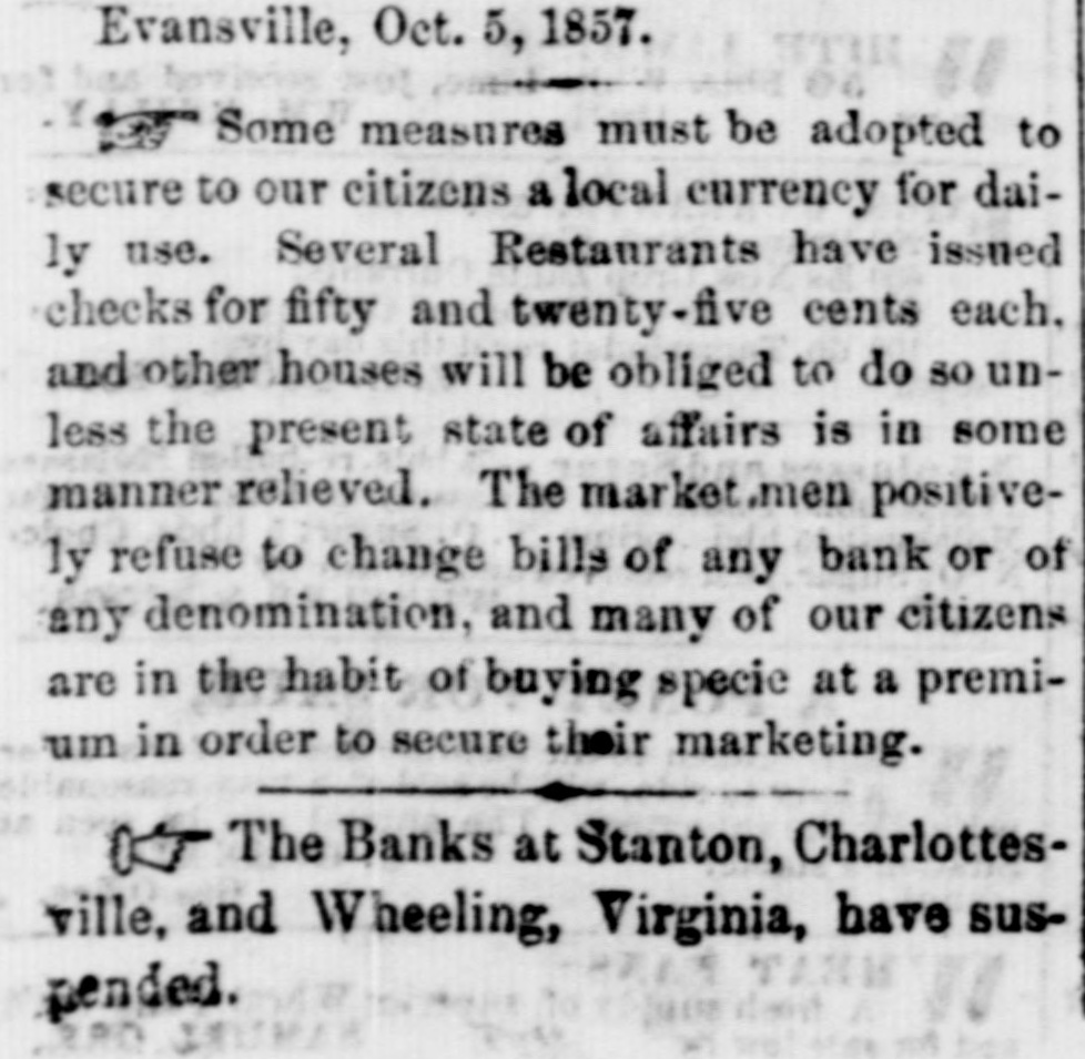 Evansville, Oct. 5, 1857. " Some measures must be adopted to secure to our citizens a local currency for daily use. Several Restaurants have issued checks for fifty and twenty-five cents each, and other houses will be obliged to do so unless the present state of affairs is in some manner relieved. The market men positively refuse to change bills of any bank or of any denomination, and many of our citizens are in the habit of buying specie at a premium in order to secure their marketing. as The Banks at Stanton, Charlottesville, and Wheeling, Virginia, have suspended.