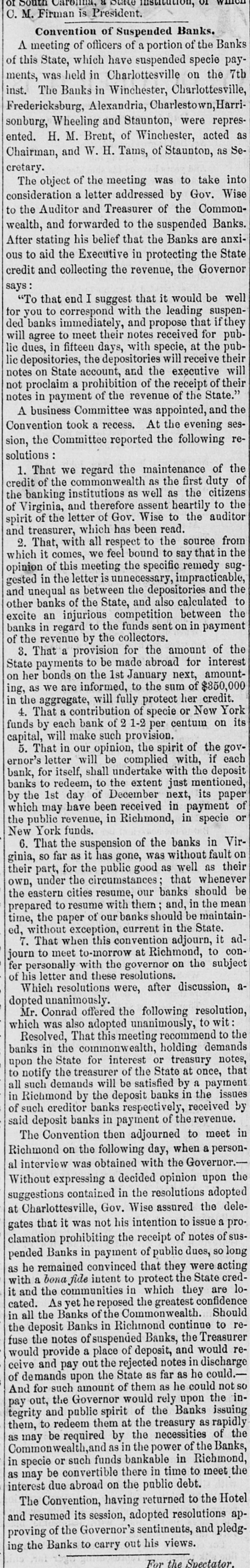 South or C. M. Firman is President. Convention of Suspended Banks. A meeting of officers of a portion of the Banks of this State, which have suspended specie payments, was held in Charlottesville on the 7tb inst. The Banks in Winchester, Charlottesville, Fredericksburg, Alexandria, Charlestown, sonburg, Wheeling and Staunton, were represented. H. M. Brent, of Winchester, acted as Chairman, and W. H. Tams, of Staunton, as Secretary. The object of the meeting was to take into consideration a letter addressed by Gov. Wise to the Auditor and Treasurer of the Commonwealth, and forwarded to the suspended Banks. After stating his belief that the Banks are anxious to aid the Executive in protecting the State credit and collecting the revenue, the Governor says: "To that end I suggest that it would be well for you to correspond with the leading suspended banks immediately, and propose that if they will agree to meet their notes received for public dues, in fifteen days, with specie, at the public depositories, the depositories will receive their notes on State account, and the executive will not proclaim a prohibition of the receipt of their notes in payment of the revenue of the State." A business Committee was appointed, and the Convention took a recess. At the evening session, the Committee reported the following resolutions : 1. That we regard the maintenance of the credit of the commonwealth as the first duty of the banking institutions as well as the citizens of Virginia, and therefore assent heartily to the spirit of the letter of Gov. Wise to the auditor and treasurer, which has been read. 2. That, with all respect to the source from which it comes, we feel bound to say that in the opinion of this meeting the specific remedy suggested in the letter is unnecessary, impracticable, and unequal as between the depositories and the other banks of the State, and also calculated to excite an injurious competition between the banks in regard to the funds sent on in payment of the revenue by the collectors. 3. That a provision for the amount of the State payments to be made abroad for interest on her bonds on the 1st January next, amounting, as we are informed, to the sum of $850,000 in the aggregate, will fully protect her credit. 4. That a contribution of specie or New York funds by each bank of 2 1-2 per centum on its capital, will make such provision. 5. That in our opinion, the spirit of the governor's letter will be complied with, if each bank, for itself, shall undertake with the deposit banks to redeem, to the extent just mentioned, by the 1st day of December next, its paper which may have been received in payment of the public revenue, in Richmond, in specie or New York funds. 6. That the suspension of the banks in Virginia, SO far as it has gone, was without fault on their part, for the public good as well as their own, under the circumstances that whenever the eastern cities resume, our banks should be prepared to resume with them and, in the mean time, the paper of our banks should be maintained, without exception, current in the State. 7. That when this convention adjourn, it adjourn to meet to-morrow at Richmond, to confer personally with the governor on the subject of his letter and these resolutions. Which resolutions were, after discussion, adopted unanimously. Mr. Conrad offered the following resolution, which was also adopted unanimously, to wit: Resolved, That this meeting recommend to the banks in the commonwealth, holding demands upon the State for interest or treasury notes, to notify the treasurer of the State at once, that all such demands will be satisfied by a payment in Richmond by the deposit banks in the issues of such creditor banks respectively, received by said deposit banks in payment of the revenue. The Convention then adjourned to meet in Richmond on the following day, when a personal interview was obtained with the Governor.Without expressing a decided opinion upon the suggestions contained in the resolutions adopted at Charlottesville, Gov. Wise assured the delegates that it was not his intention to issue a proclamation prohibiting the receipt of notes of suspended Banks in payment of public dues, so long as he remained convinced that they were acting with a bona fide intent to protect the State credit and the communities in which they are located. As yet he reposed the greatest confidence in all the Banks of the Commonwealth. Should the deposit Banks in Richmond continue to refuse the notes of suspended Banks, the Treasurer would provide a place of deposit, and would receive and pay out the rejected notes in discharge of demands upon the State as far as he could.And for such amount of them as he could notso pay out, the Governor would rely upon the integrity and public spirit of the Banks issuing them, to redeem them at the treasury as rapidly as may be required by the necessities of the Commonwealth,and as in the power of the Banks, in specia or snch funds bankable in Richmond,