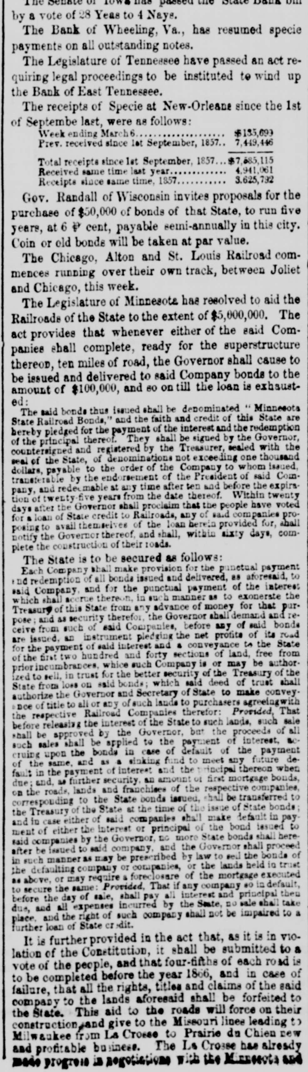 by a vote of 28 Yeas to 4 Naye. The Bank of Wheeling, Va., has resumed specie payments on all outstanding notes. The Legislature of Tennessee have passed an act requiring legal proceedings to be instituted to wind up the Bank of East Tennessee. The receipts of Specie at New-Orleane since the 1st of September last, were 88 follows: $155,693 Week ending March6 7,449,446 Prev. received since let September, 1857.. $7,585,115 Total receipts since 1st September, 1857 4,941,061 Received same time last year 3,625,792 Receipts since same time, 1857 Gov. Randall of Wisconsin invites proposals for the purchase of $50,000 of bonds of that State, to run five years, at 6 ₽ cent, payable semi-annually in this city. Coin or old bonds will be taken at par value. The Chicago, Alton and St. Louis Railroad commences running over their own track, between Joliet and Chicago, this week. The Legislature of Minnesote has resolved to aid the Railroads of the State to the extent of $5,000,000. The act provides that whenever either of the said Companies shall complete, ready for the superstructure thereor, ten miles of road, the Governor shall cause to be issued and delivered to said Company bonds to the amount of $100,000, and 60 on till the loan is exhausted: The said bonds thus issued shall be denominated Minnesota State Railroad Bonds," and the faith and credit of this State are hereby pledged for the payment of the interest and the redemption of the principal thereof. They shall be signed by the Governor, countersigned and registered by the Treasurer, sealed with the seal of the State, of denominations not exceeding one thousand dollars, payable to the order of the Company to whom issued, transferable by the endorsement of the President of said Company, and redec mable at any time after ten and before the expirstion of twenty five years from the date thereof. Within twenty days after the Governor shall proclaim that the people have voted for a loan of State credit to Railroads, any of said companies proposing to avail themselves of the loan berein provided for, shall notify the Governor thereof, and shall, within sixty days, complete the construction of their roads. The State is to be secured as follows: Each Company shall make provision for the punetual payment no redemption of all bonds issued and delivered, as aforesaid, to said Company and for the punctual payment of the interest which shall accrue thereon, in such manner as to exonerate the Treasury of this State from any advance of money for that purpose; and as security therefor, the Governor shall demand andreceive from such of said Companies, before any of said bonds are issued. an instrument pledging the net profits of its road for the payment of said interest and a conveyance to the State of the first two hundred and forty sections of land, free from prior incumbrances, whice such Company is or may be authorized to sell, in trust for the better security of the Treasury of the State from loss on said bonds; which said deed of trust shall authorize the Governor and Secretary of State to make conveyDoe of title to all or any of such lands to purchasers agreeingwith the respective Railroad Companies therefor: Provided, That before releasing the interest of the State to such lands, such sale shall be approved by the Governor, but the proceeds of all such sales shall be applied to the payment of interest, BC cruing upon the bonds in case of default of the payment of the same, and as a sinking fund to meet any future default in the payment of interest and the rincipal thereon when due: and, as further security. an amount of first mortgage bonds, lands and franchises the companies, to the State bonds issued, to on corresponding the roads, of respective shall be of transferred State bonds the Treasury of the State at the time of the issue and in case either of said companies shall make default in pay ment of either the interest or principal of the bond issued to said companies by the Governor, DC more State bonds shall here after be issued to said company, and the Governor shall proceed in such manner as may be prescribed by law to and the bonds of the defaulting company or companies, or the lands held in trust as above, or may require & foreclosare of the mortgage executed to secure the same: Provided, That if any company #0 in default, before the day of sale, shall pay all interest and principal then due, and all expenses incurred by the State, no sale shall take place. and the right of such company shall not be impaired to a further loan of State edit. It is further provided in the act that, as it is in VIOlation of the Constitution, it shall be submitted to & vote of the people, and that four-fifths of each road is to be completed before the year 1866, and in case of failure, that all the rights, titlea and claims of the said company to the lands aforesaid shall be forfeited to the State. This aid to the roads will force on their construction and give to the Missouri linee leading to Milwaukee from La Crosse to Prairie da Chien new and profitable business. The Ls Crosse has already mm progreis is Regosiations with the Misseets and